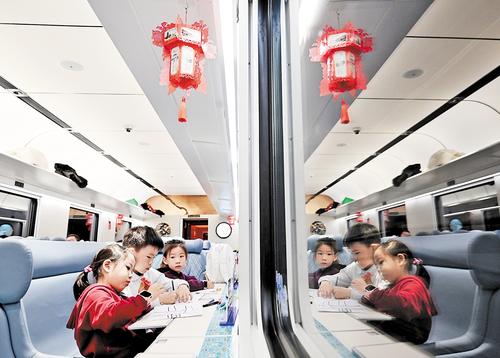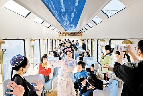 这趟全景观光旅游列车不仅旅游氛围拉满,而且将车厢变身移动文化空间,让游客在火车上就开始旅行,体验具有河北特色的文旅活动。人偶演员穿梭在车厢间,与游客友情互动。舞蹈演员翩翩起舞,现代舞与快闪表演轮番登场,游客纷纷举起手机记录精彩瞬间,不少人还加入到舞蹈队伍中。在多功能娱乐车厢,小朋友们用彩色马克笔在车窗上绘画,还有黏土手作等活动吸引了众多家庭参与。随着广播声响起,“滑雪公开课”开课了,专业教练拿着滑雪装备,认真地讲解滑雪基础知识和技巧,让游客抵达雪场前就能提前“热身”,体验到冰雪运动的乐趣。