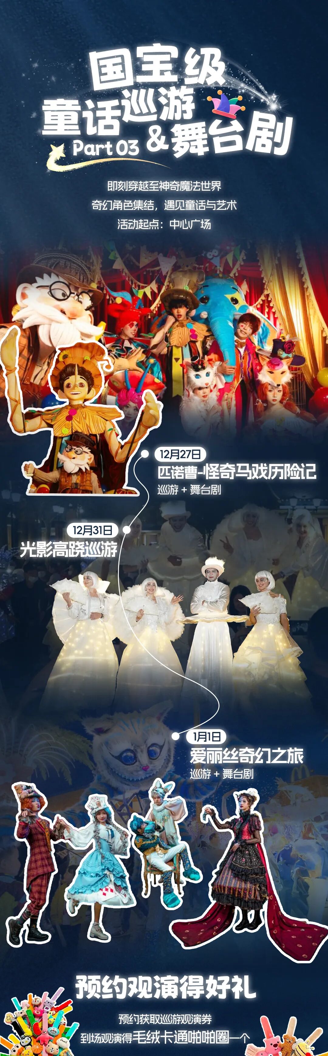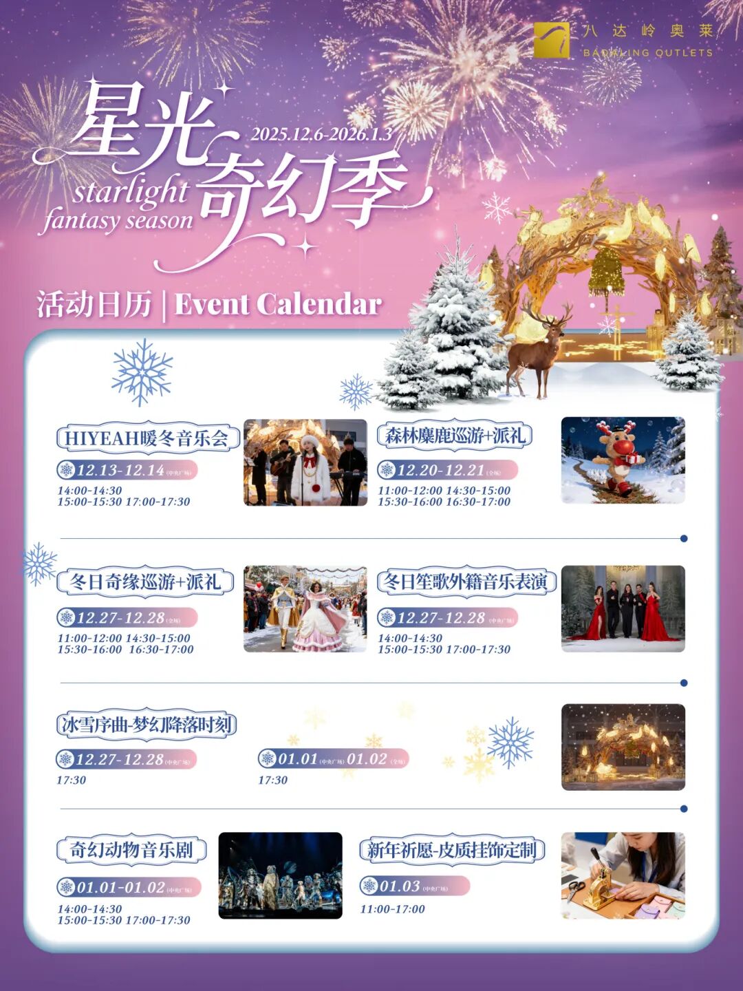 元旦来八达岭奥特莱斯,解锁星光奇幻季浪漫时光,元旦当天,星光森林舞台,将上演百老汇风《奇幻动物音乐剧》,还有“冰雪序曲-梦幻降落时刻”飘雪体验,一秒坠入冬日童话,可参与“新年祈愿-皮质挂饰定制”,定制专属新年礼,更有满返福利加码,快来打卡!