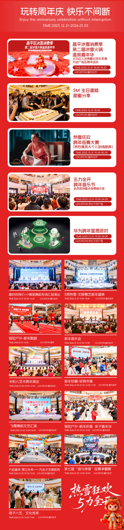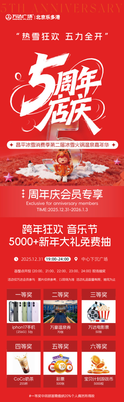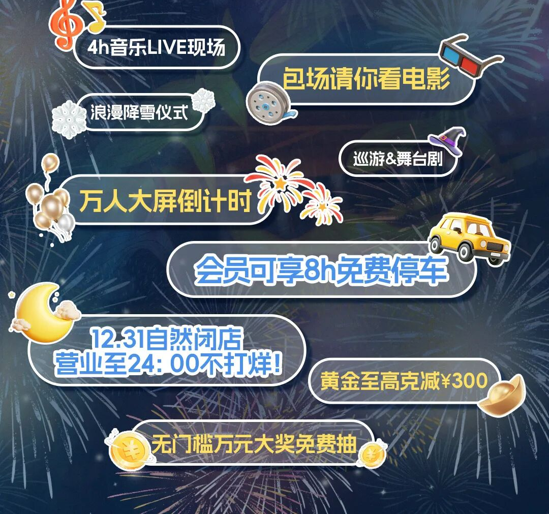 当跨年撞上店庆,乐多港万达广场直接火力全开,12重重磅好礼+15重精彩活动双重暴击,玩转周年庆,嗨翻跨年夜,第二届冰雪火锅温泉嘉年华火热开涮,新年音乐会奏响狂欢序曲,整点抽奖、万人跨年倒计时,持续点燃新春的欢乐氛围,更有新年祈福、热血跑酷、街舞争霸赛,萌娃才艺秀、好物市集等精彩活动不间断,传统韵味碰撞时尚潮玩,这场跨年盛宴,错过真的要等一整年。