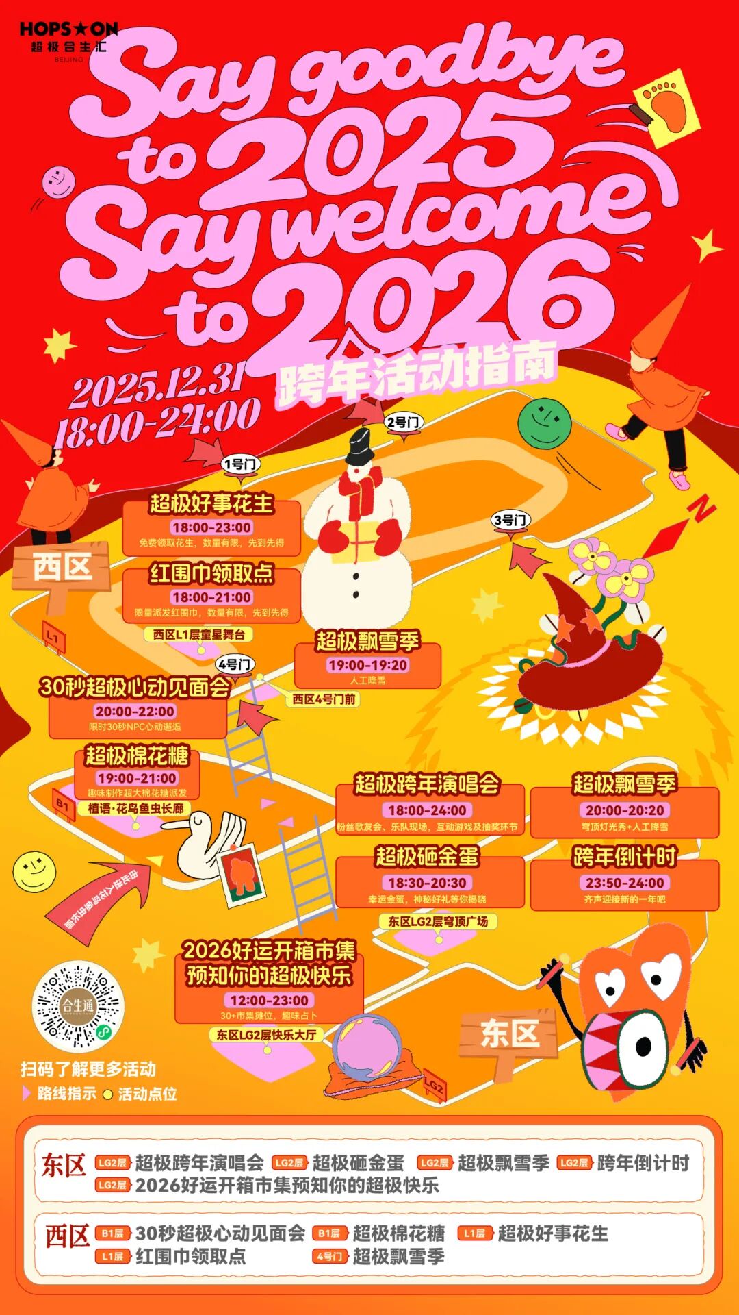 双旦期间,北京超极合生汇,以“Say goodbye to 2025, Say welcome to 2026.”为主题,N + 主题玩法集结,承包你的跨年夜狂欢,6小时的超极跨年演唱会热血开唱,薛之谦粉丝音乐会、young漫音乐总决赛,流行音乐演出轮番献唱,临近零点万人倒计时齐声呐喊,在超极灯光秀震撼梦幻氛围中,迎接新年的到来,还有30s超极心动见面会近距离贴贴,超极飘雪季打造浪漫冬季场景,超极砸金蛋开出新年好运,好运开箱市集逛到腿软,万兽吉・新年活动等互动潮玩上新,千万别错过。