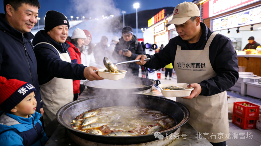 免费鲜鱼宴吃到爽,源自官厅水库的直供鲜鱼在现场两口大锅里翻滚烹煮,袅袅热气裹挟着鱼肉的鲜香,漫过整个市集,张山营村民、社工家庭与夜场雪友可免费品鉴,先到先得,这份冬日里的热乎滋味,暖胃又暖心。