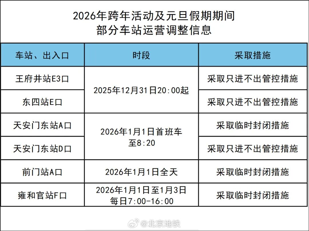为满足2026年跨年活动及元旦假期期间乘客出行需求,确保乘客平安、顺畅出行,北京地铁公司密切关注旅游景点、商圈等周边车站客流情况,对部分线路车站采取“分时段”运营调整措施,请乘客提前安排出行计划。详情如下: