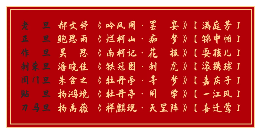 涵盖老旦、正旦、作旦、刺杀旦、闺门旦、贴旦、武旦