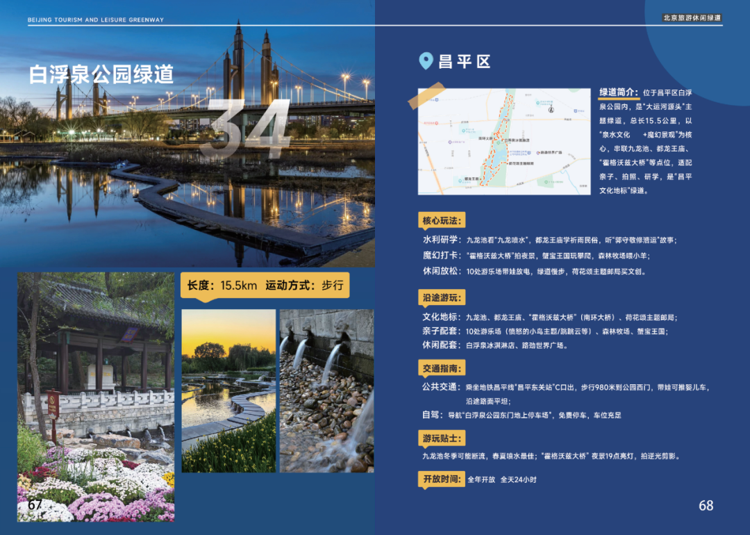 绿道位于昌平区白浮泉公园内,是“大运河源头”主题绿道,总长15.5公里,以“泉水文化+魔幻景观”为核心,串联白浮泉遗址-九龙池、都龙王庙、“霍格沃兹大桥”等点位,适配亲子、拍照、研学,是“昌平文化地标”绿道。