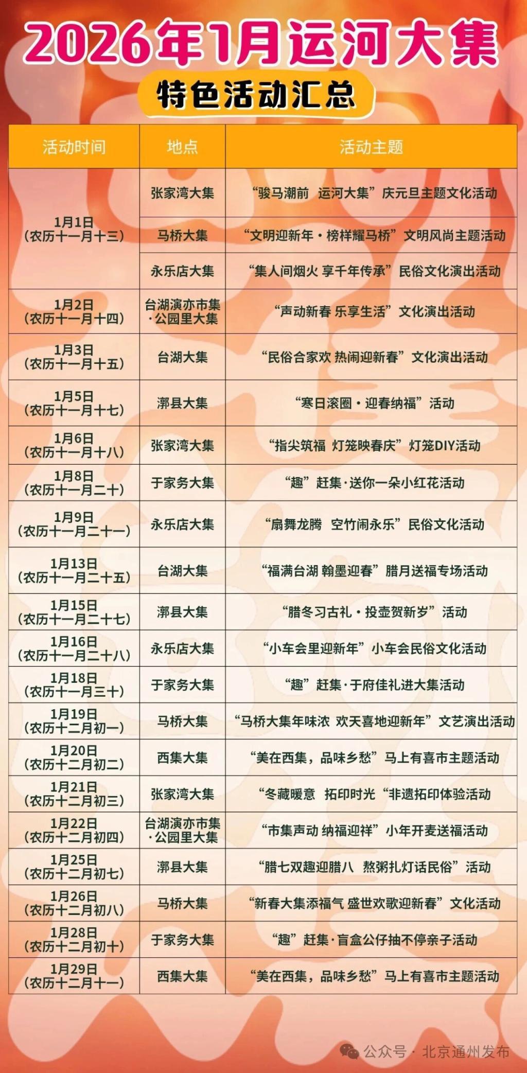 赶集日历。通州区委宣传部供图2026年1月的“运河大集”,还安排了不少特色活动。比如,2026年第一天,400多年历史的通运桥畔,张家湾大集热闹开集!鼓乐喧天、人声鼎沸,中幡艺人精彩献艺,商贩吆喝声此起彼伏。张家湾大集有200多个商户,统计数据显示,每次开集平均接待市民7000人次,销售额20余万元。
