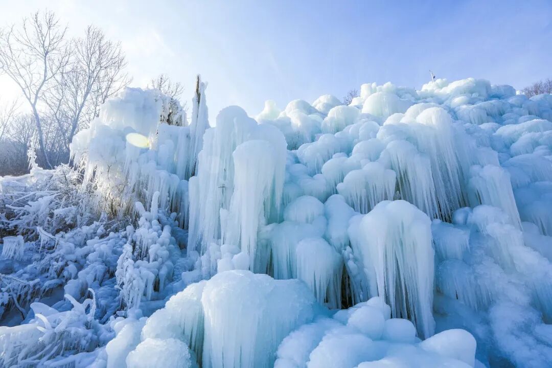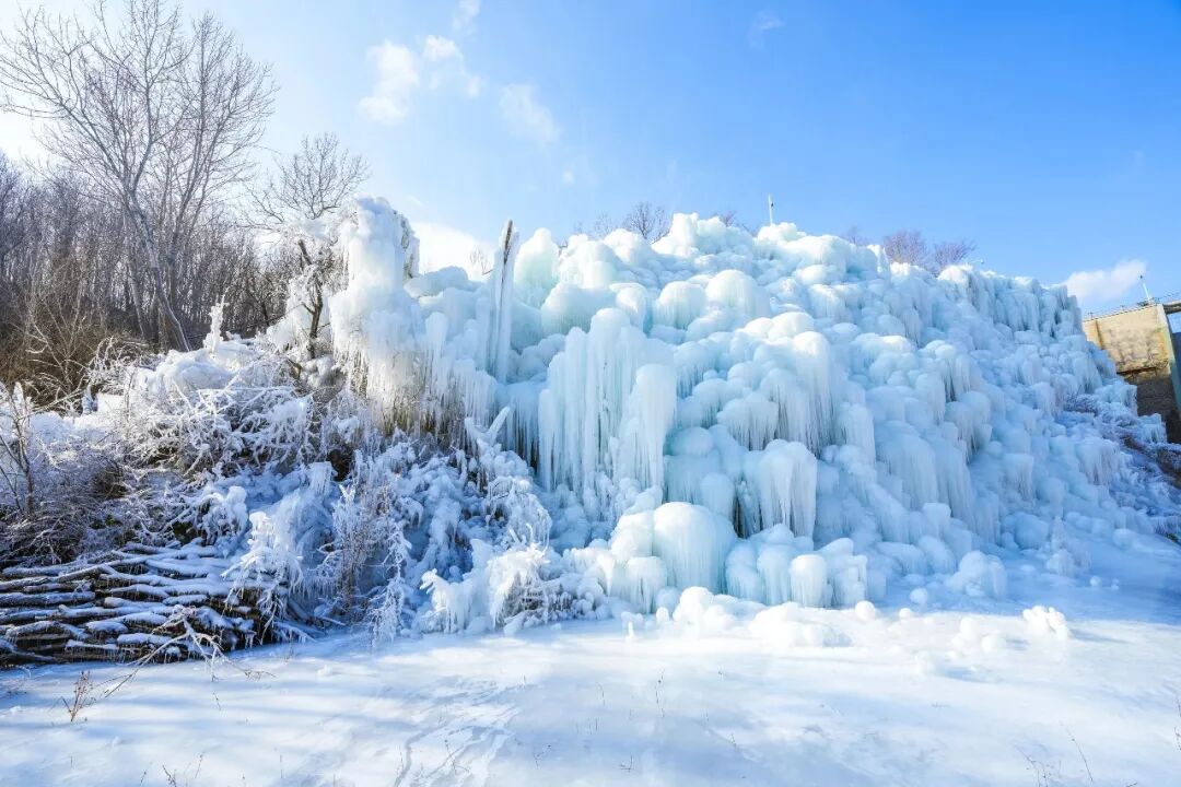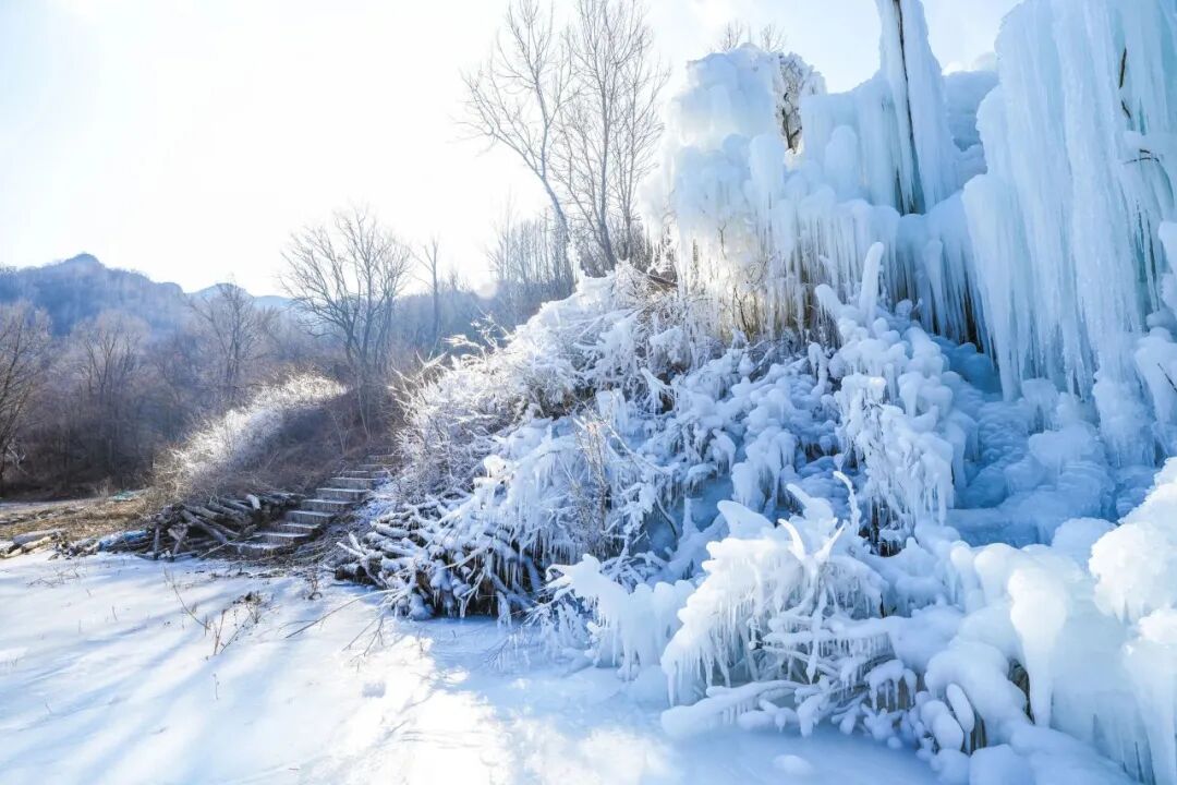水长城的冬日藏着自然馈赠,水流凝固成玉柱冰帘与入水长城相映成趣,阳光洒落时冰晶流光溢彩,踏冰而行,尽览塞外风光与江南秀韵的独特交融,岸边冰瀑垂挂如银带,冰笋、冰花形态万千,在山水与古长城间漫步,沉浸式感受这份静谧纯粹的冬日浪漫。
