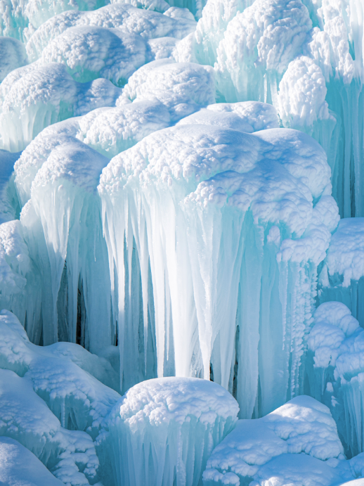 山谷之中,冰瀑高悬,宛如时间静止的白色瀑布,气势磅礴却又静谧唯美,冰瀑上的冰棱长短不一,粗细各异,有的尖锐如剑,有的圆润似柱,相互交织,构成了一幅幅奇妙的图案,让人不禁感叹大自然的鬼斧神工。