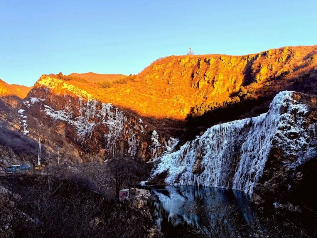 踏入虎峪,仿佛进入一个晶莹剔透的童话世界,当水流在低温下悄然凝固,冰柱层层叠叠,在阳光照射下,闪烁着蓝白相间的光芒,宛如大自然精心雕琢的水晶帘幕,虎峪冰瀑的最大魅力,在于其“一步一景”的独特体验,沿途的冰瀑各具特色,有的雄浑壮阔,有的精巧别致,若天气晴好,下午三至四点,夕阳洒落群山,将整片冰晶世界染成璀璨金黄,这便是“虎峪辉金”奇观,那种震撼人心的美,唯有亲临才能体会。