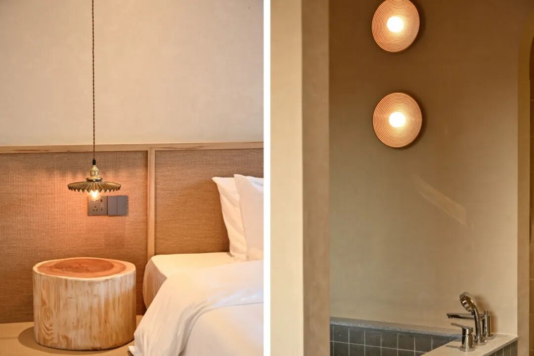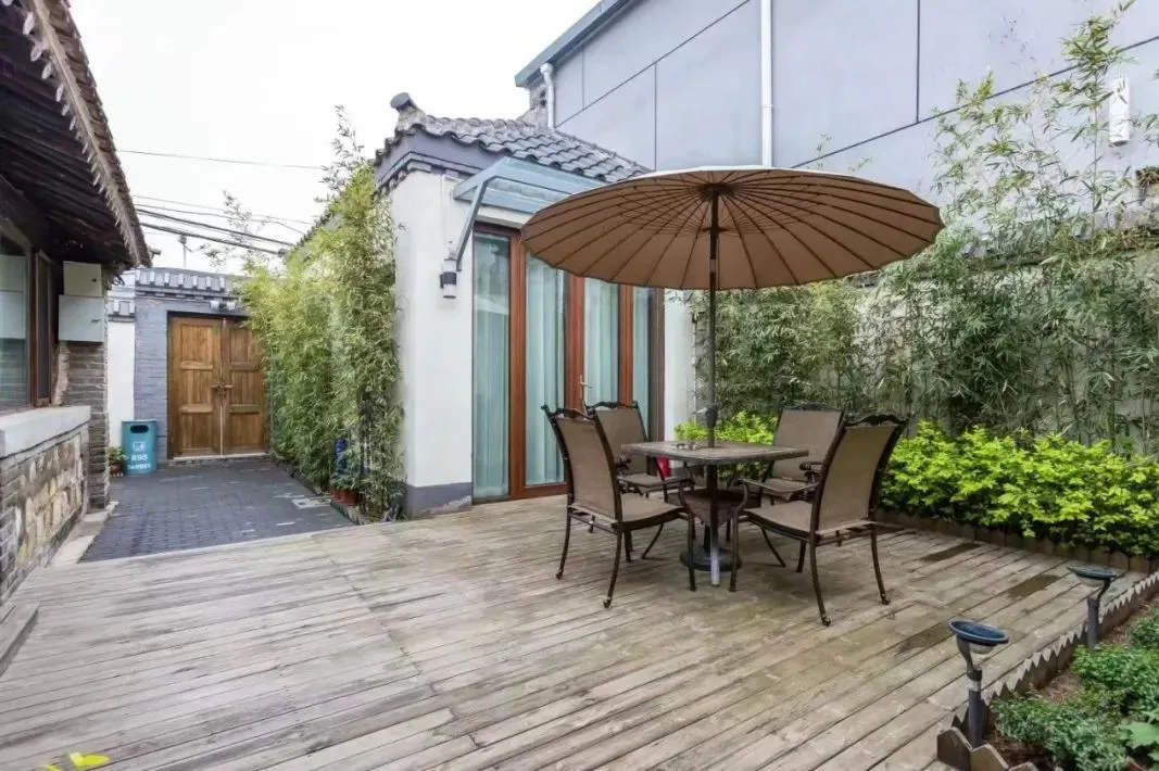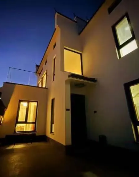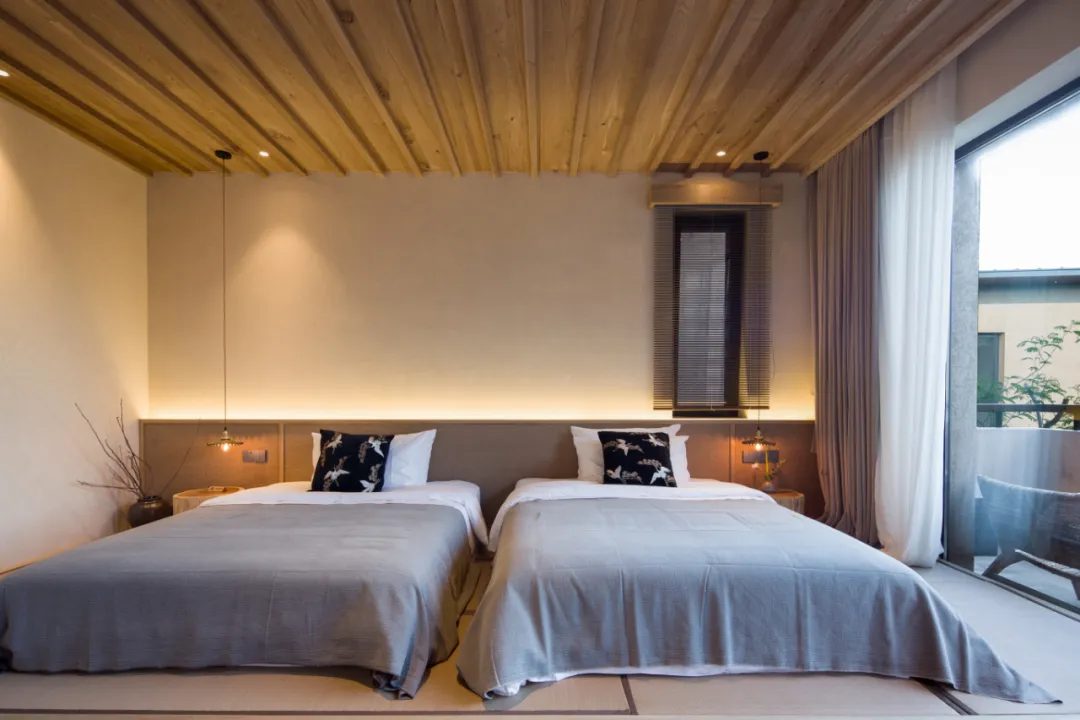瓦舍民宿由三个大小不同的独立院落组合而成,有着北京四合院的方正,同时兼具里日式庭院的雅致之美,青砖灰瓦间藏着书卷气;出门即乡野,入门即庭院。庭院里的花瓣缓缓飘落,走廊环绕的琉璃灯营造柔美氛围,在院子里赏赏月光看看电影,十分惬意。