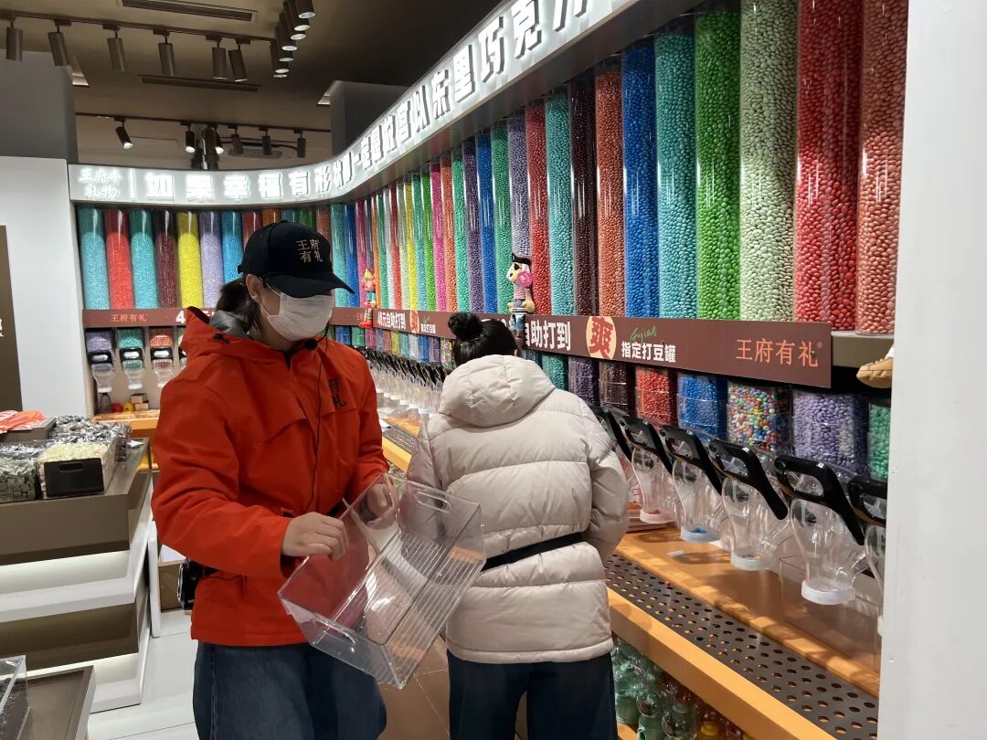 沿着参观路线走进店内,布满一整面墙的彩色巧克力豆抓住了每个人的眼球。在一个打豆罐前,小朋友正在家长的帮助下动手打豆,轻轻扳一下开关,彩色的巧克力豆就哗啦啦地从罐子里滚出。