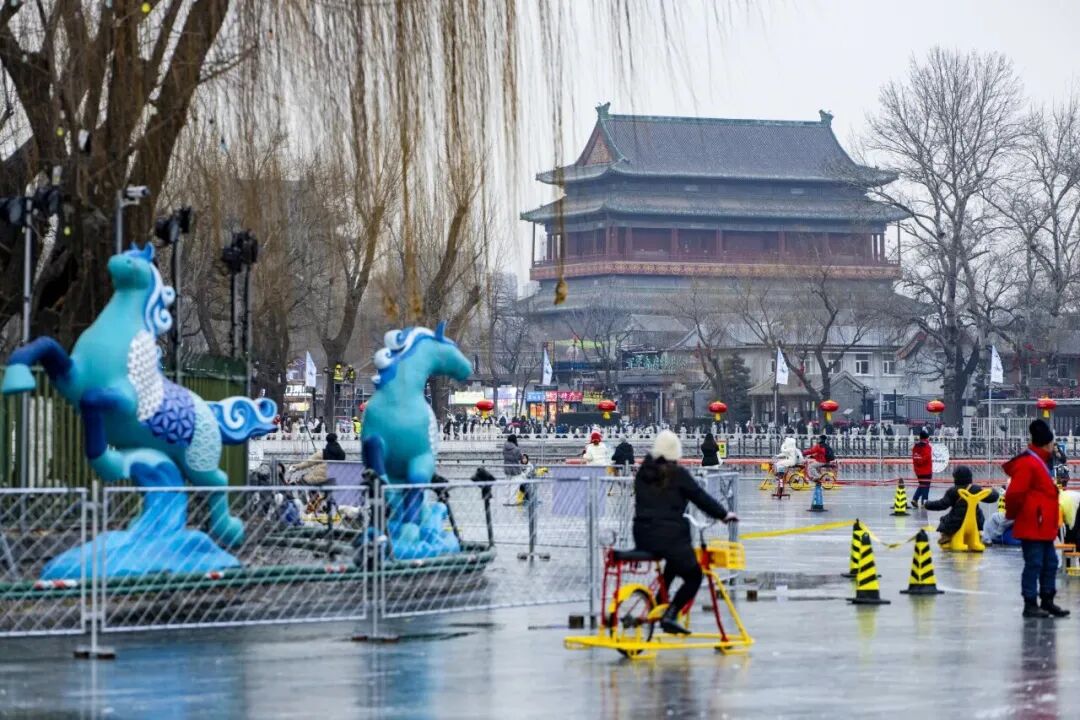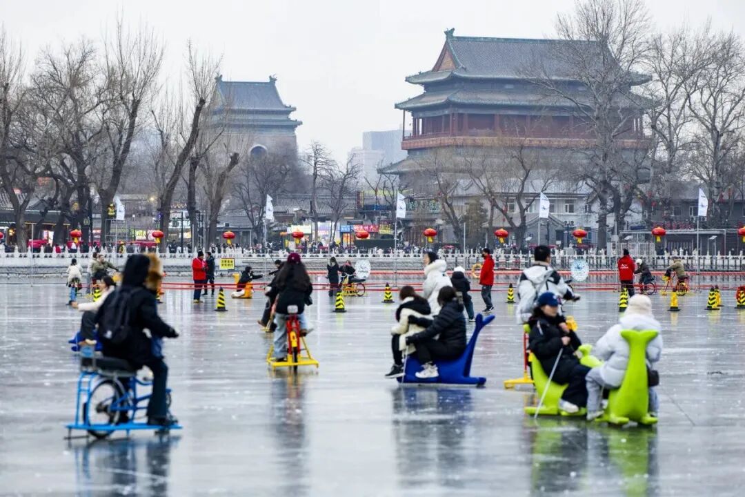 除了传统的冰上娱乐项目,今年什刹海冰场还可体验机器狗拉雪橇,“科技+冰雪”为你带来不一样的冬日体验,来到灵动的蓝色飞马雕塑附近,举起手机定格冰面、骏马与鼓楼同框一刻,就让冬日里的北京地标与欢乐瞬间,一并收入你的镜头之中吧。