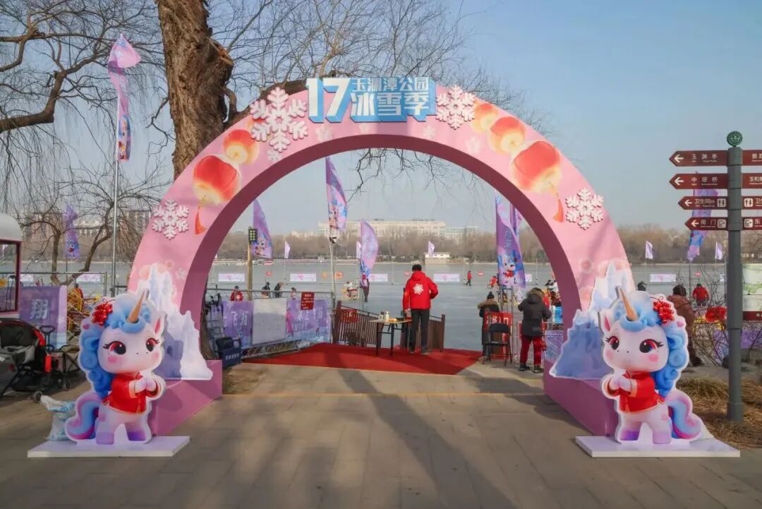 今年的什刹海冰雪嘉年华以“飞马踏冰”为主题,前海冰场入口及围栏处的道旗等装饰,巧妙融入马年元素。