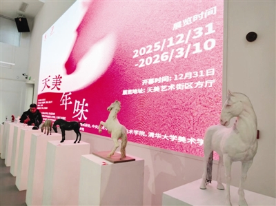街区展示区方厅内,第二届“天美年味”作品展正在此进行展览,中央美术学院、中国美术学院、清华大学美术学院、天津美术学院等多家院校的精选作品汇聚其中,艺术家和学生马年说马事,用风格迥异的版画表现形式,描绘出骏马的新年风采。