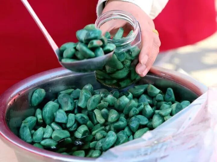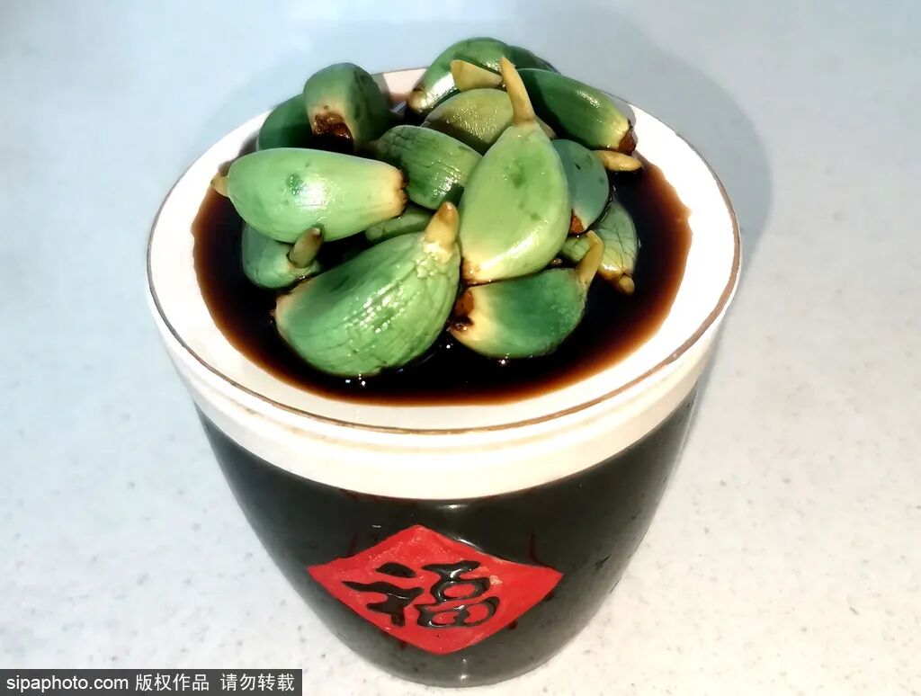 泡腊八蒜是北方,尤其是华北地区的一个习俗。顾名思义,就是在腊月初八这天泡制蒜。做法简单,把剥了皮的大蒜瓣放到密封罐子里,泡上醋即可。泡蒜的醋即为腊八醋,腊八醋可以做凉菜,可以配饺子,北方人的春节少不了它。