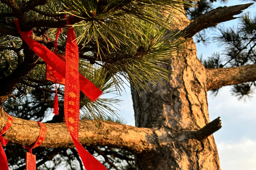 龙头三拜祈福仪式超庄重!一拜古松长青,二拜五谷丰登,三拜老少安康。红带挂松枝、红墙映古树,手写福牌、拍照打卡+现场洗印,定格与古树的专属记忆。