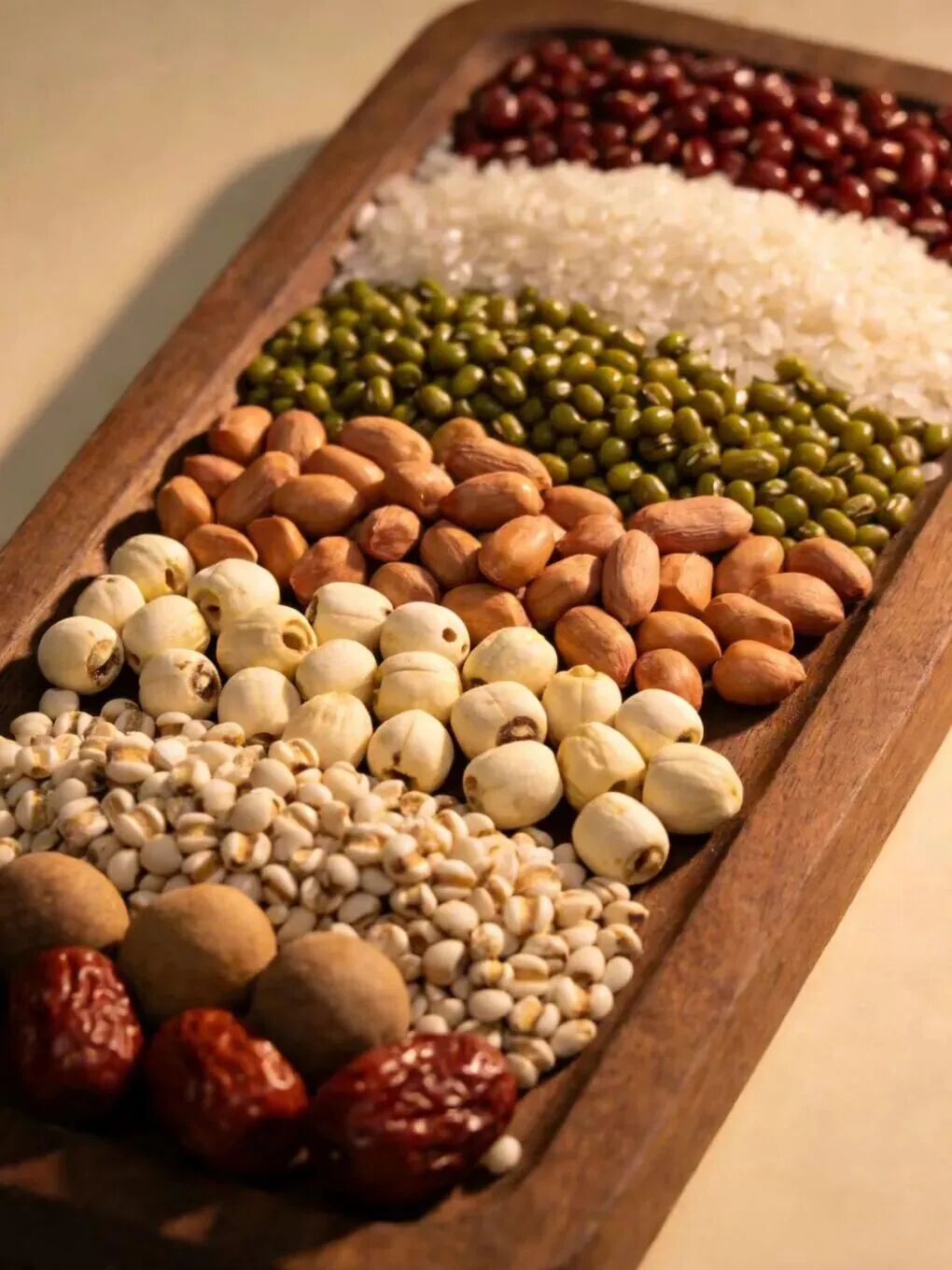 中国各地腊八粥的花样,争奇竞巧,品种繁多,用料也十分讲究。一般用黄米、白米、江米、小米、菱角米、栗子米、花生米、榛子仁、松子以及白糖、红糖等合水熬煮。有的人家,还会增加桂圆、莲子、百合、枸杞、紫米、香米、薏仁米等。