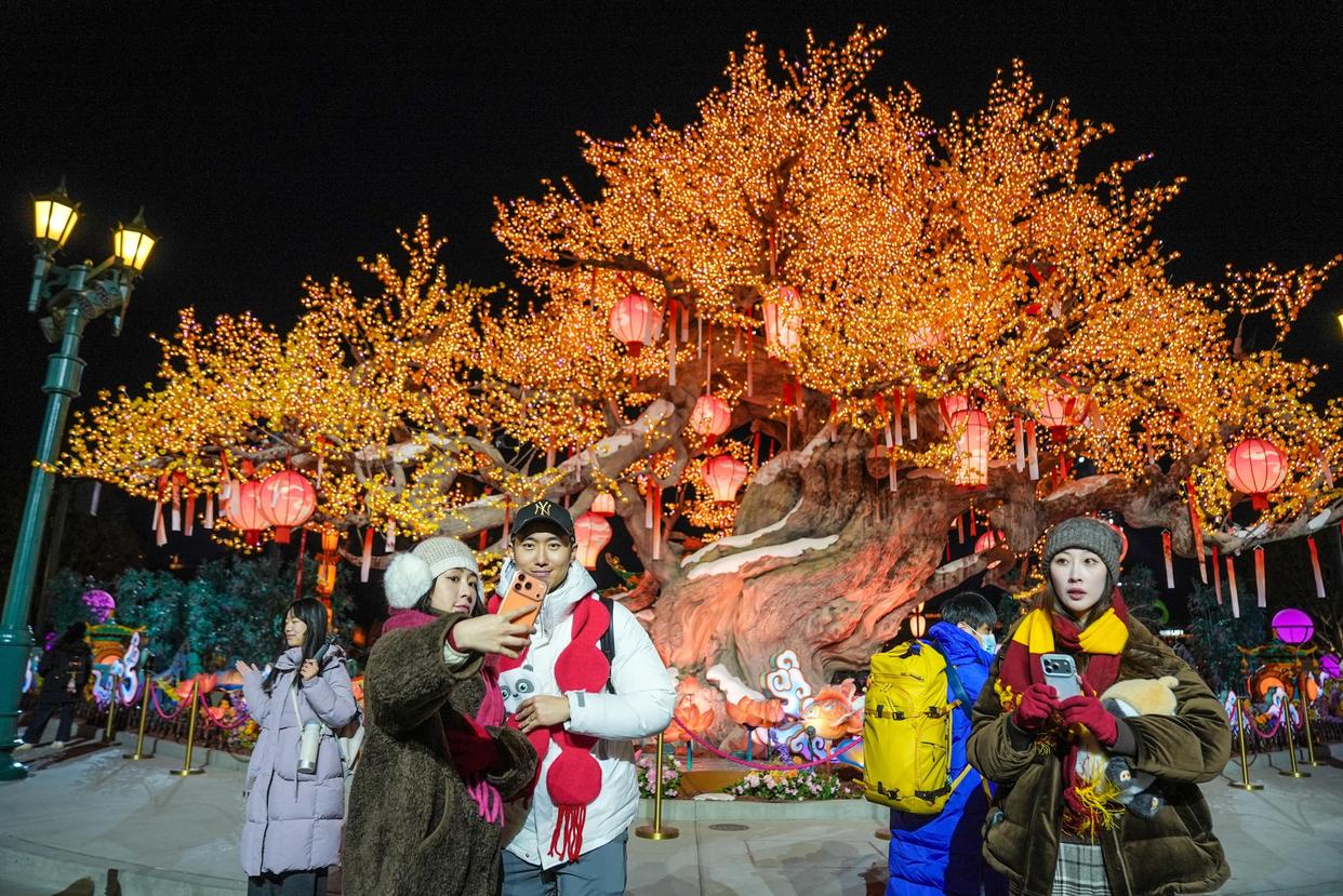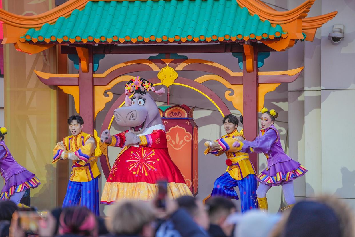 爆肚粉、肉丝煎饼、绿豆糕、糖人、糖葫芦……坐落于好莱坞剧场的环球新春广场烟火气升腾,大批游客在此开启“逛吃”模式,等待着观看环球中国年新春特别演出。今年的演出以《团圆啦!》为名崭新回归,带来全新编舞与音乐,《功夫熊猫》的阿宝、《马达加斯加》的朱利安国王、《神偷奶爸》的小黄人等14位明星角色悉数登场,传统艺术表演元素迎来全新升级,融入了刀马旦、川剧变脸、蹬鼓杂技等形式。演出结尾部分,绚丽的彩带漫天飞舞,现场尖叫声欢呼声连连,游客们纷纷按下相机快门,记录下这一难忘时刻。