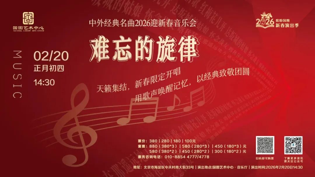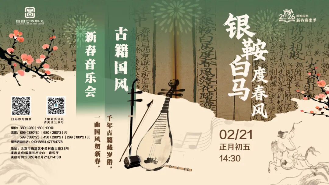 岁启新元,艺暖新春。「缤纷国图·2026新春演出季」,五天五场,场场精彩,用多元艺术演绎新春祝福,用文化温情凝聚团圆力量。赶快点击文末阅读原文进行购票!这个春节,告别喧嚣,奔赴国图艺术中心·音乐厅,与家人挚友一同沉浸艺术之美,共贺马年新春、共品岁月艺美,度过一个祥和雅致、回味悠长的文化新年!