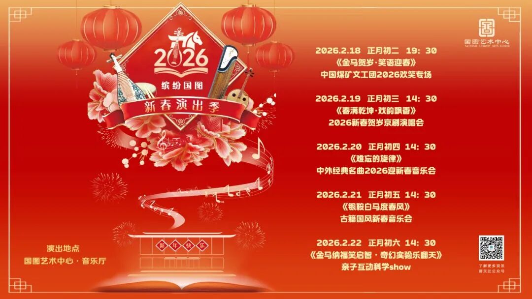 乙巳辞旧岁,丙午迎新春。当红灯高挂映暖街巷,当团圆欢歌萦绕耳畔,国图艺术中心秉持“艺术传承、创新演绎、臻至服务、共享精彩”之初心,精心筹备「缤纷国图·2026新春演出季」。正月初二至初六,五天连台、五场精品,以曲艺、京剧、经典音乐、国风演绎、亲子智趣五大艺术形态,为京城百姓献上一场醇厚雅致的新春文化盛宴,邀你与家人挚友相聚音乐厅,在丝竹雅韵、梨园风华与欢声笑语中,共度一个有温度、有格调的文化新年。