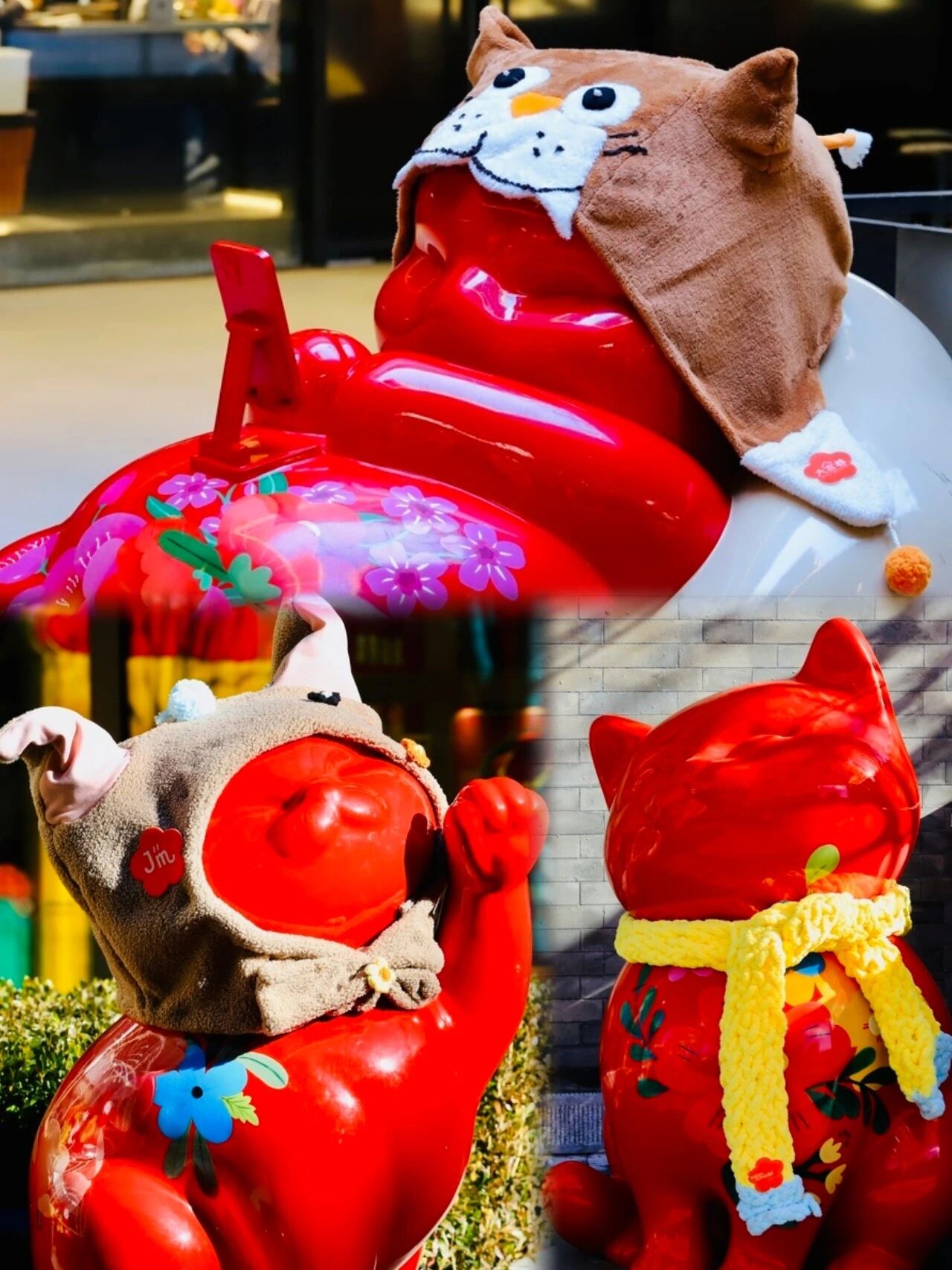 近日,北京大吉巷的户外雕塑群融入了围脖元素,其中猫咪造型的装饰尤为突出,“大吉猫”雕塑系上红围脖、戴上毛线帽,呈现出萌趣喜庆的模样,与街区的鲤鱼光影装置共同构成“冬日浪漫”打卡点。(图源:sipa图库)