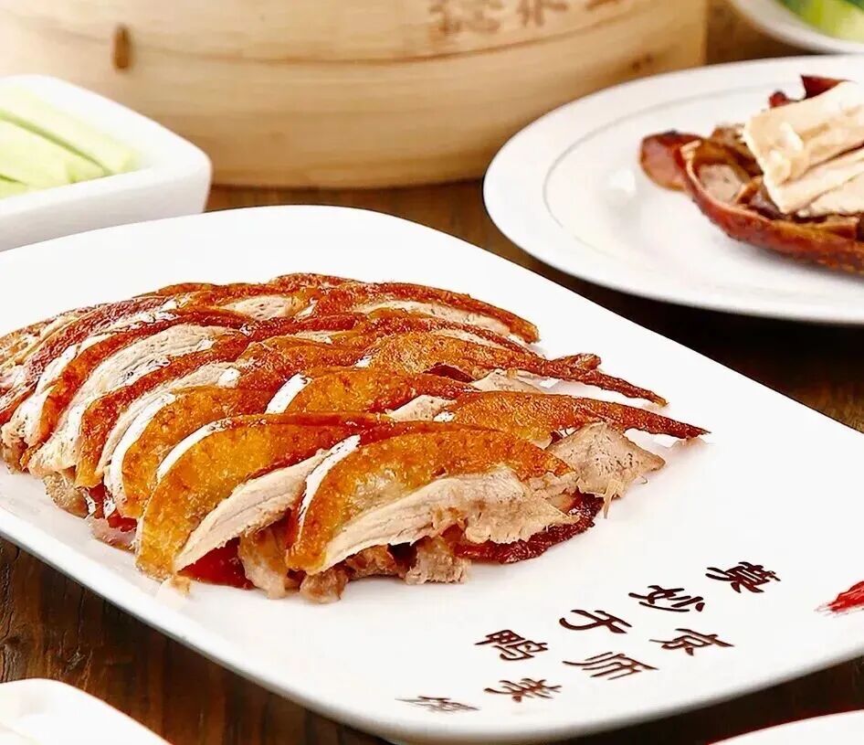 北京全聚德烤鸭店始建于清代同治三年(1864)。挂炉烤鸭系以果木为燃料,将鸭坯挂在特制的烤炉中明火烤制而成,烤出的烤鸭风味醇香,以皮层香酥、肉质鲜嫩、色彩鲜亮、气味芳香的特色而蜚声中外。除烤鸭外,全聚德还首创了全鸭宴席,可与烤鸭配合进食。