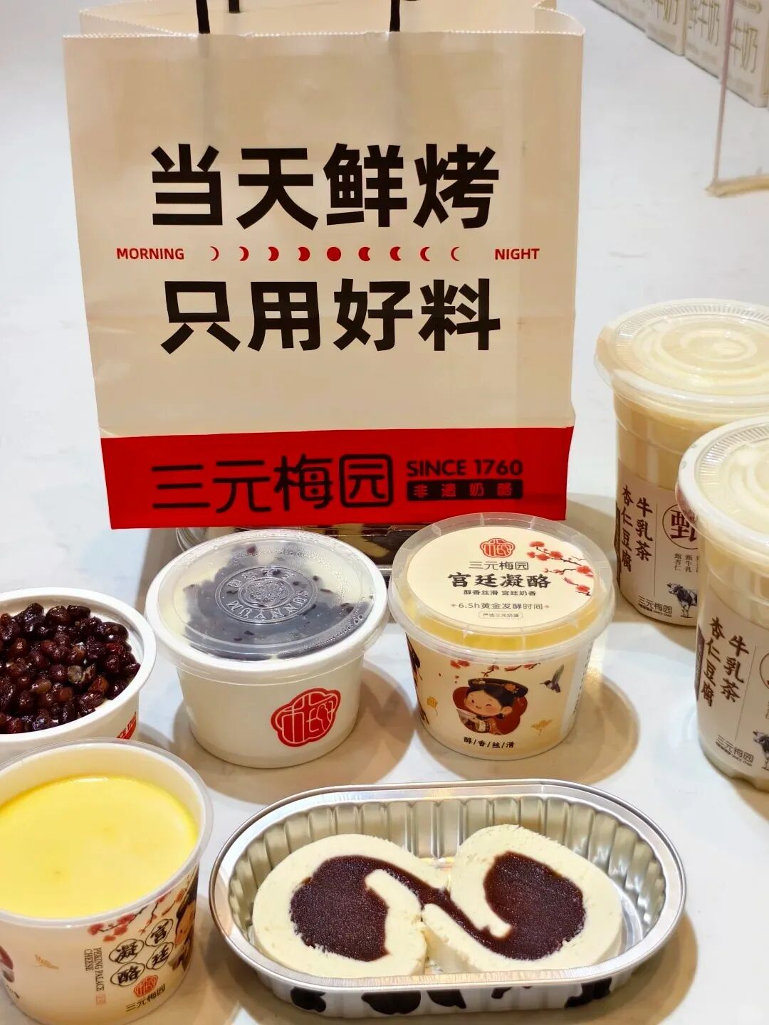 三元梅园用现代匠心复刻宫廷秘方,让曾经专属于皇城的凝脂奶酪、清润杏仁豆腐……走出红墙,走入寻常街巷,成为每个人都能品尝到的历史滋味。同时,它的“宫廷奶品制作技艺”,是北京市非物质文化遗产,其技艺源流纯正,严格遵循古法,再现了紫禁城里的奶润醇香。