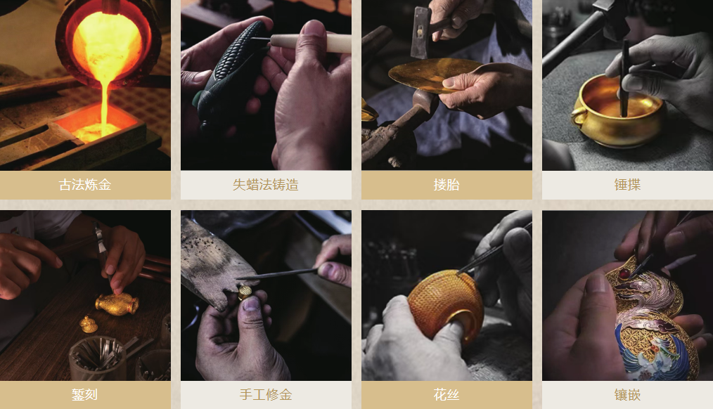 古法黄金是以中国古代宫廷制金工艺为基础,结合手工打造黄金饰品的制作技艺。其核心工艺包括“古法炼金、失蜡法铸造、搂胎、锤揲、錾刻、打磨、错金、花丝镶嵌、高温珐琅”等,每一步都需匠人们数十道工序的精细雕琢。花丝镶嵌需将黄金拉成细丝编织成型,錾刻则用特制工具在表面雕刻出立体纹样,高温珐琅用釉料点缀黄金饰品更增一抹浪漫色彩。