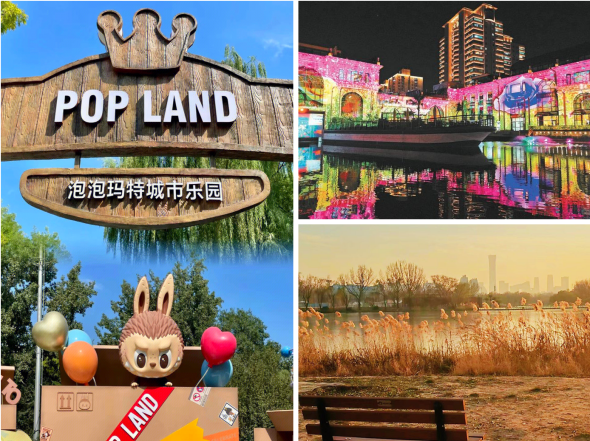 亮马河风情水岸(全天开放,游船冬季停航)、朝阳公园(06:00-22:00)、泡泡玛特城市乐园(10:00-20:00)