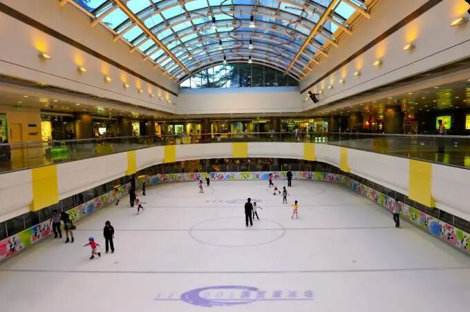 北京首个商场内真冰冰场(1999年开放,老牌地标),冰面800平方米(可容纳150人),冰面恒温17℃;上方为透明玻璃穹顶,白天可仰望蓝天白云,搭配动感音乐,氛围轻松休闲;定期举办冰上嘉年华等特色活动。
