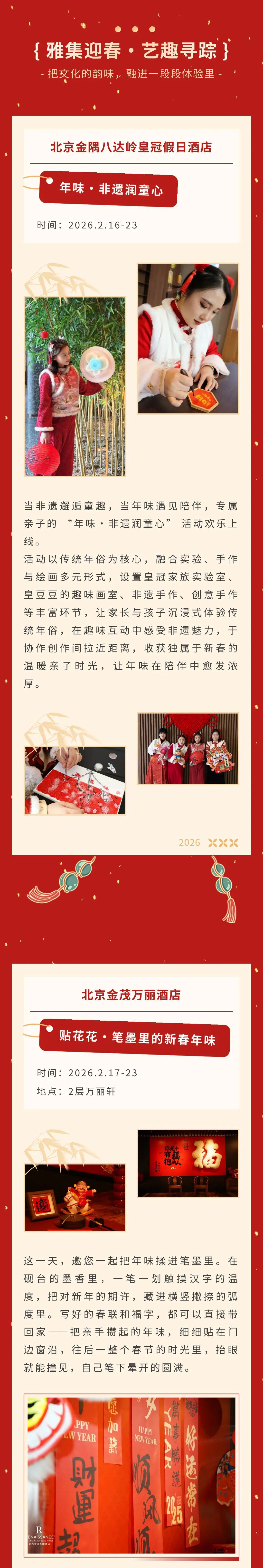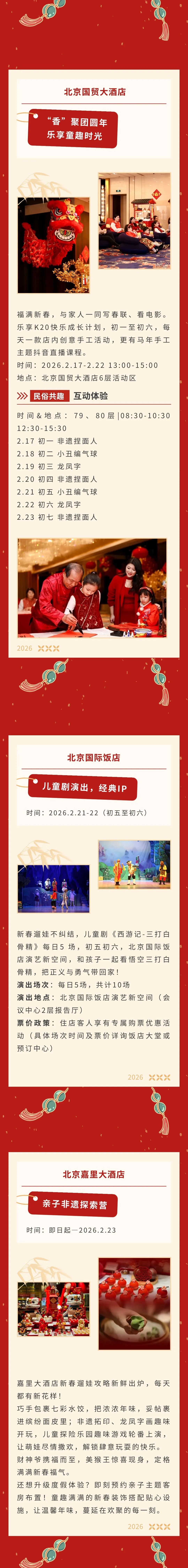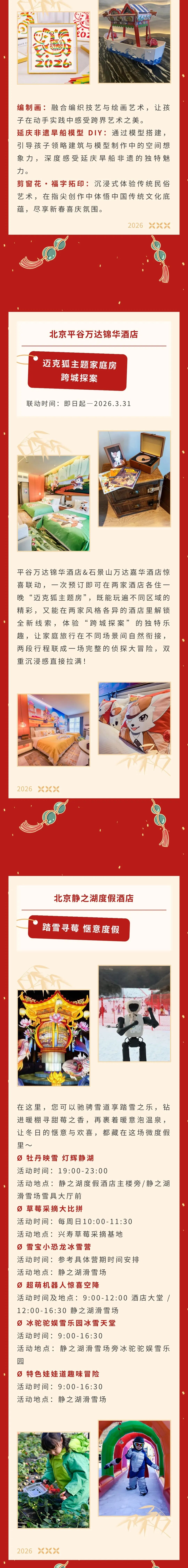 这一次,我们推开了传统文化的雅致之门,在墨香楹联间写福迎新,也走进了阖家欢笑的童趣世界,让小朋友们也能沉浸式感受中国年的鲜活魅力,更有各酒店独家打造的沉浸式新春体验,带您玩转一个雅趣与欢腾交织的京味新年!