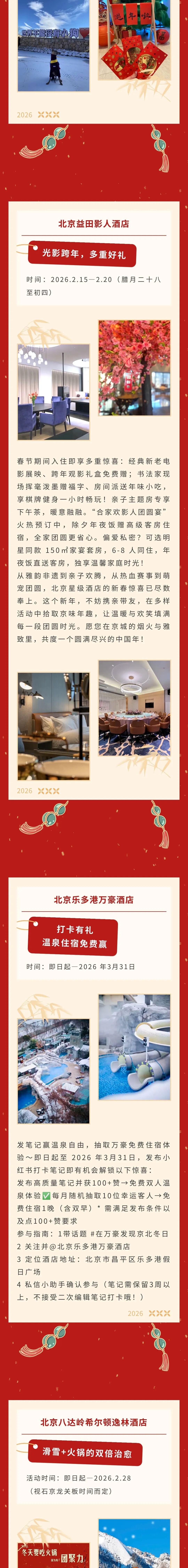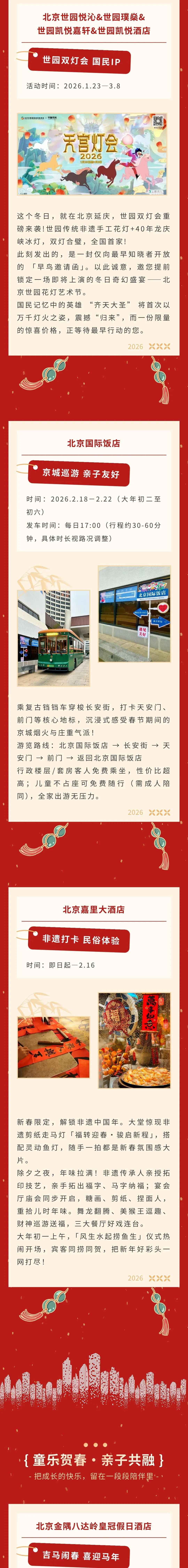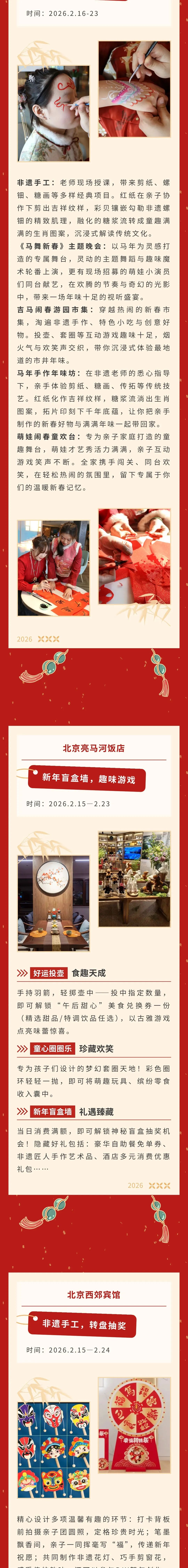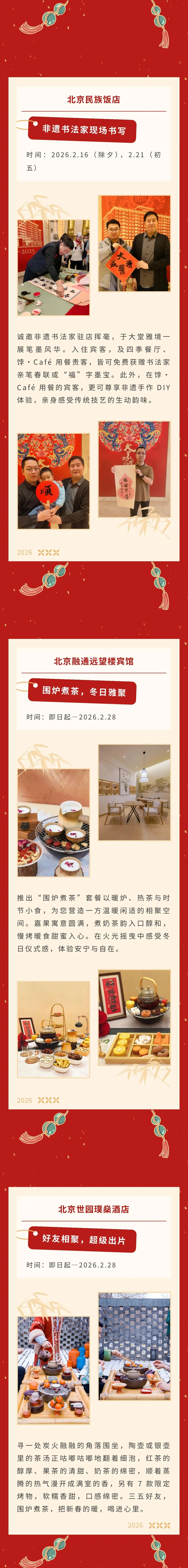 这一次,我们推开了传统文化的雅致之门,在墨香楹联间写福迎新,也走进了阖家欢笑的童趣世界,让小朋友们也能沉浸式感受中国年的鲜活魅力,更有各酒店独家打造的沉浸式新春体验,带您玩转一个雅趣与欢腾交织的京味新年!