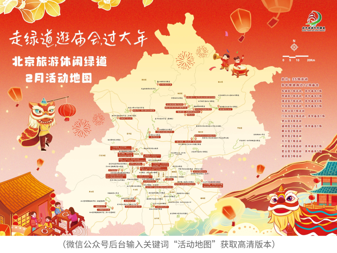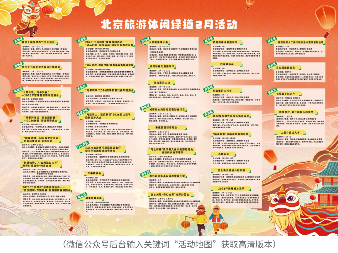 “漫步绿道 畅游北京”北京旅游休闲绿道2月活动地图正式上线,聚焦“祈福・绿道年味月”主题,串联绿道及周边35场新春活动(含12场特色庙会),覆盖东城、西城、海淀、丰台、石景山、门头沟、房山、通州、顺义、昌平、大兴、怀柔、密云、延庆等多地。活动融合科技、非遗、冰雪、民俗和戏曲等多元玩法,既有龙潭庙会“春节元宇宙”、大观园剧本杀等新潮体验,也有红螺寺祈福、长城下年俗和宛平新春戏曲等传统盛宴,还有冰雪嘉年华、徒步迎福等运动场景。这份地图让市民游客轻松“走绿道、逛庙会、过大年”,解锁全域新春年味。