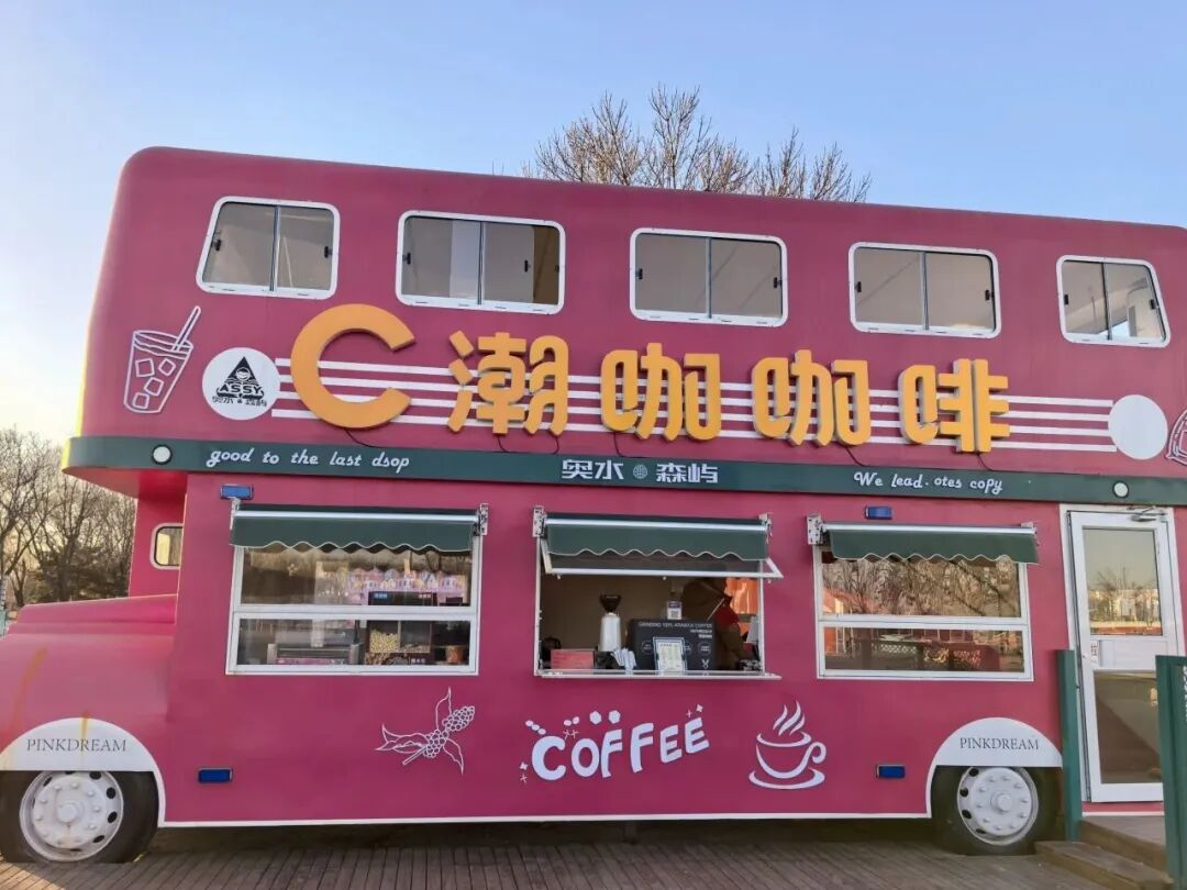 粉色巴士咖啡车:少女心爆棚的咖啡车,来杯特调咖啡,拍“巴士+咖啡”合影,甜妹风直接拿捏~