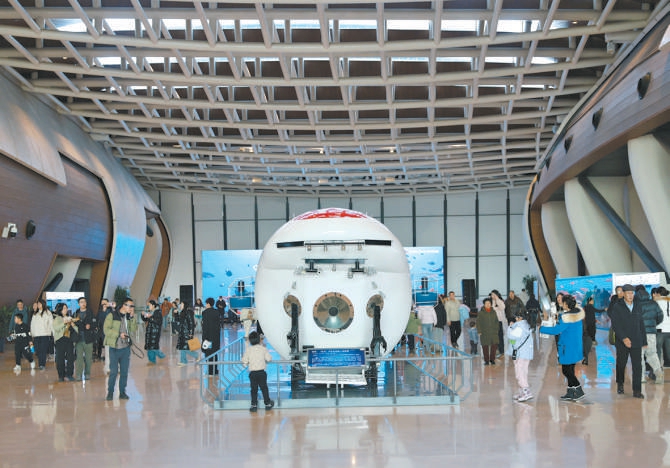北京游客张女士带着孩子到博物馆游览,她说:“海洋真是一座巨大的宝矿。展厅中展示的深海探测、深海交通、海洋能源开发等未来应用场景,让大家对未来海洋有了一份期待。”
