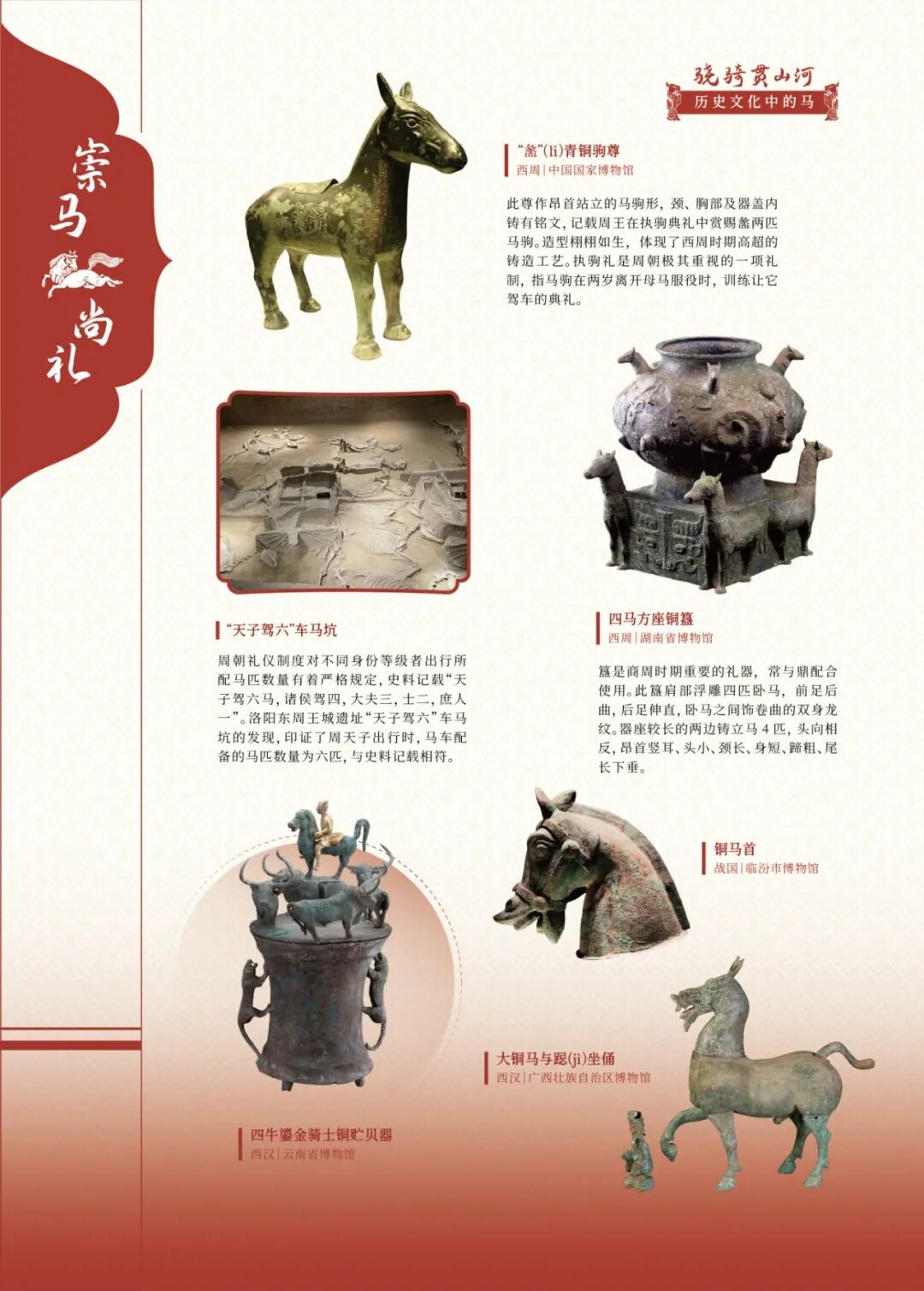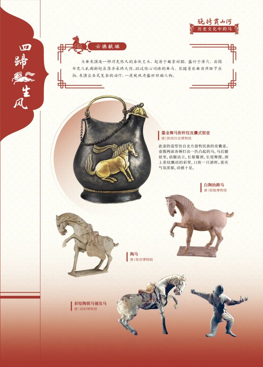 展览以“人马相伴”为主线,通过“鸿蒙生灵骏”“骁骑贯山河”“百艺载神驹”三大篇章,集中呈现从史前岩画、商周玉马、汉代铜奔马、唐代鎏金舞马,到宋元鞍马绘画、明清瓷器雕塑,乃至近现代徐悲鸿画马等跨越四千年的文物与艺术图像,从自然生态、历史长河与民俗艺术三重维度,立体展现马在中华文明中的独特地位,系统勾勒出一幅奔腾不息的中华马文化长卷。