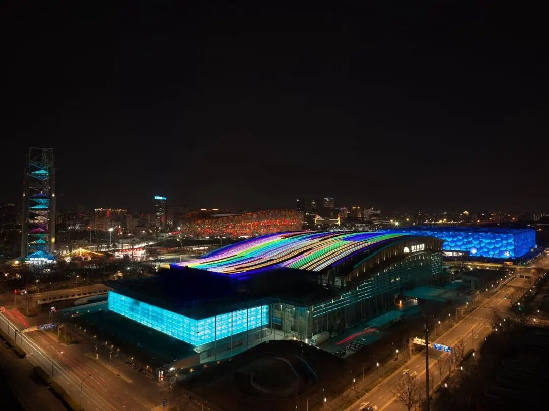 白天,阳光洒在餐桌上地标建筑的轮廓清晰可见;夜晚,华灯亮起鸟巢的红色弧线与水立方的蓝色光影交相辉映。