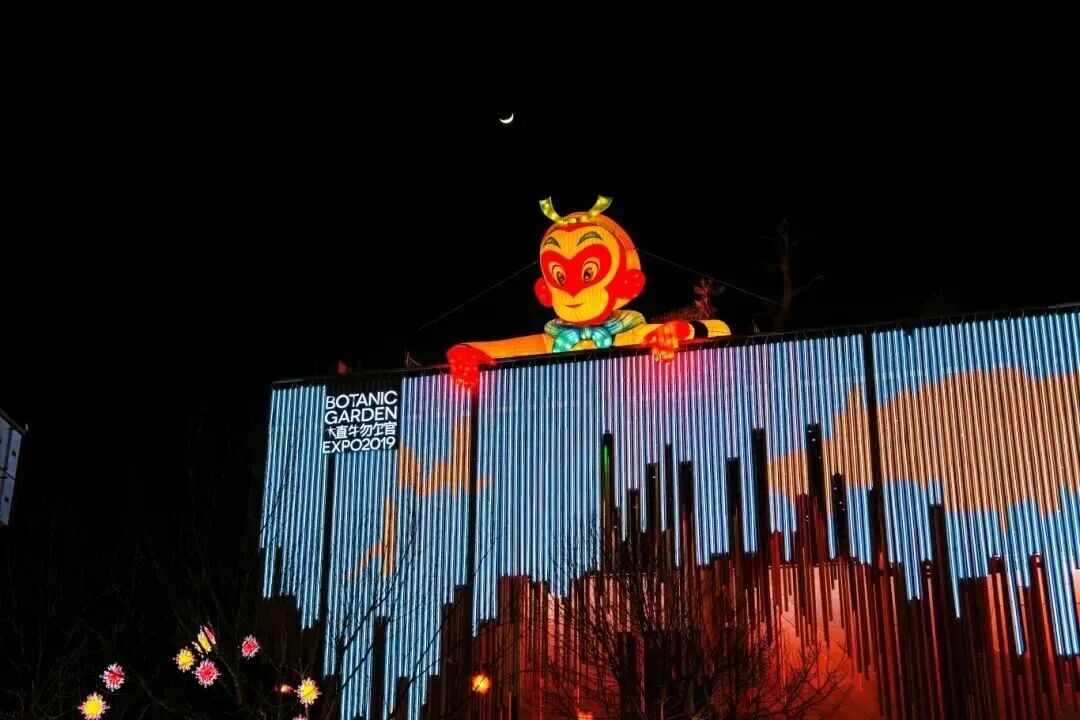 除传统花灯外,植物馆与中国馆前布设的科技灯组,通过光影秀再现《大闹天宫》经典桥段,游客可跟随齐天大圣的足迹穿梭于“蟠桃盛会”“大闹凌霄殿”等场景,感受动态光影与静态花灯的虚实交融。