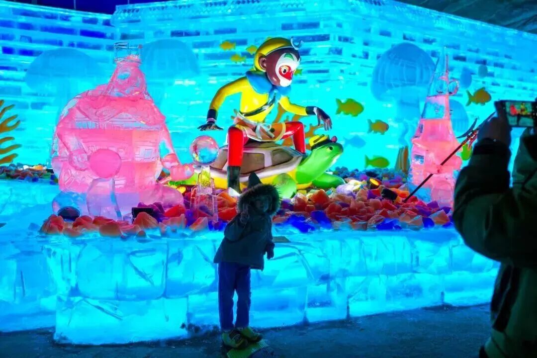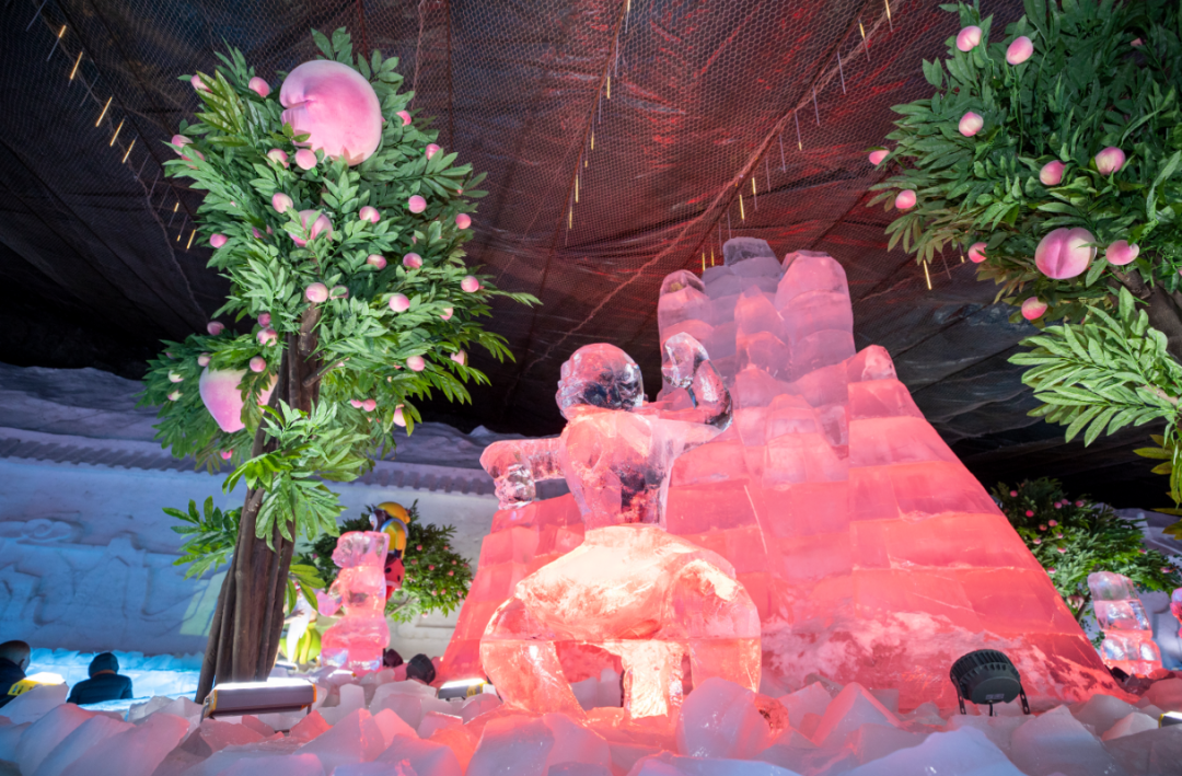 冰灯展区则将《大闹天宫》的奇幻世界搬进冰雪峡谷,“灵猴现世”“龙宫借宝”“大闹天宫”“马上封侯”四大展区串联起完整故事线,20余组大型主题冰建筑与150余件精美冰雕作品精准还原了动画中的奇幻场景。
