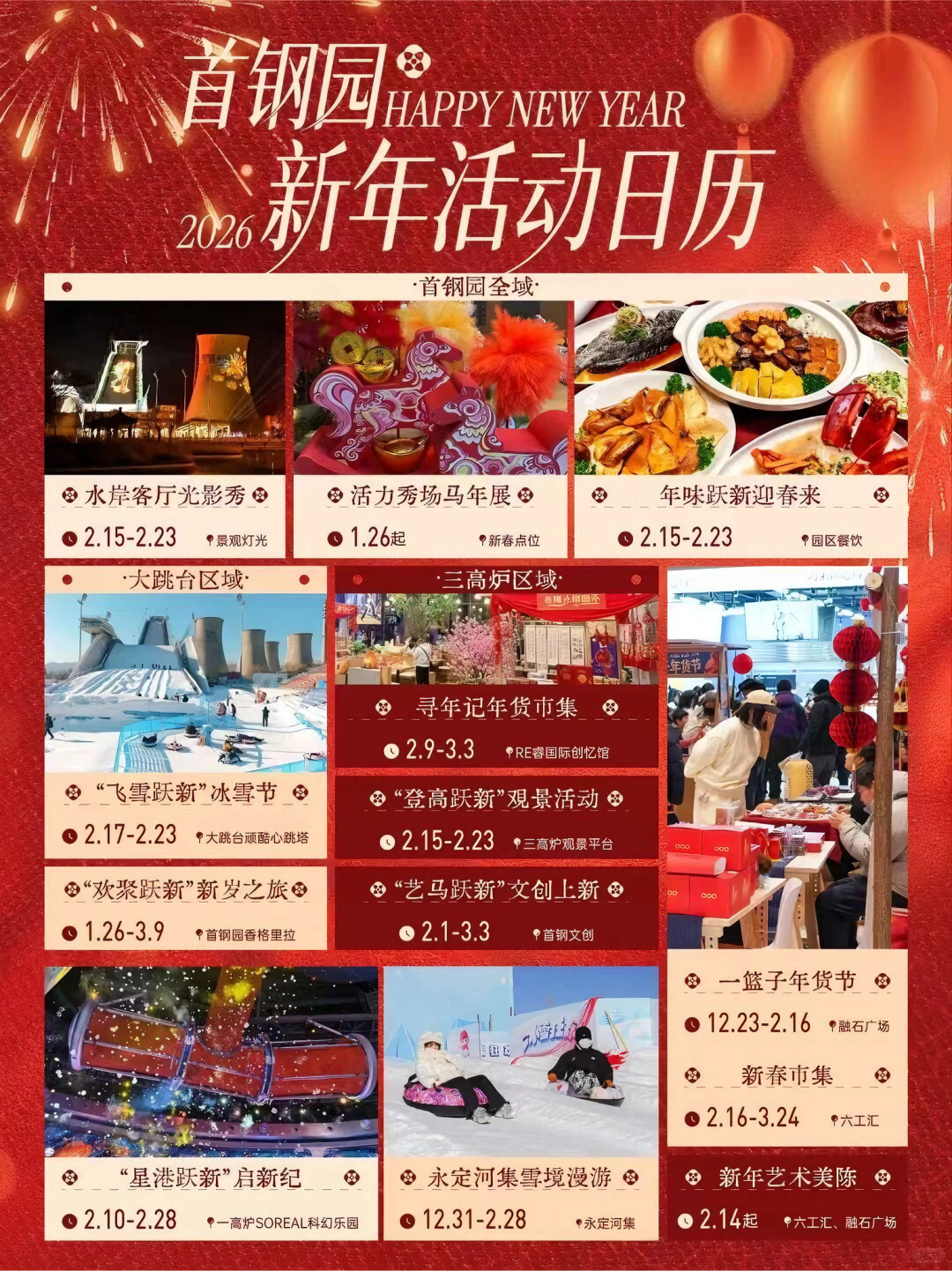 除了美丽的夜景,首钢园还推出一篮子年货市集、“好事马上到”特别企划、“寻年记”年货市集等各种新春活动,给你一个有趣好玩的假期。
