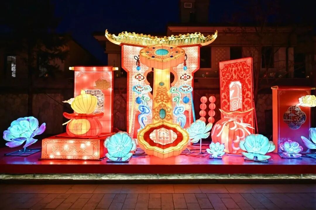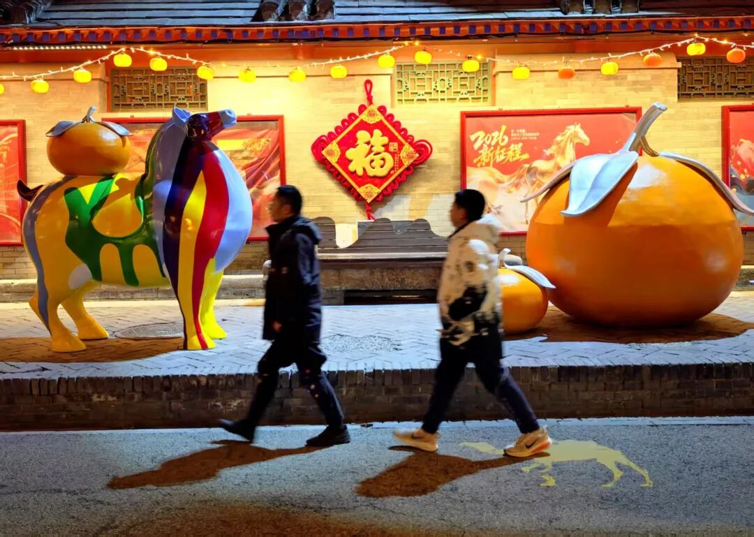 十二组特色灯景沿模式口大街和北街次第铺展,“瑞马迎春”灯组昂首腾跃,传递蓬勃朝气,“摩登雪夜”以现代灯光技术营造浪漫意境,“马上大桔”巧用谐音送上“大吉大利”的新春祝福。