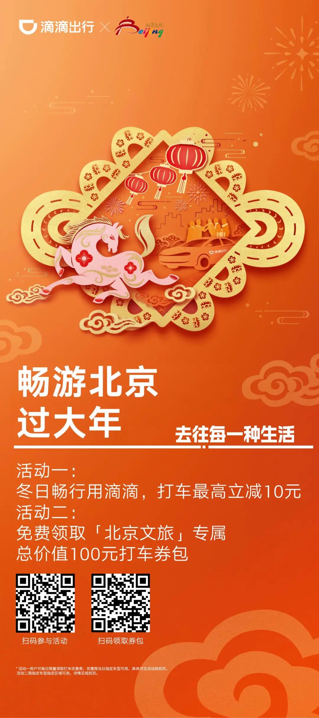 北京市文化和旅游局联合滴滴出行,为市民、游客的新春畅游之旅,送出专属打车福利,北京文旅活动滴滴专属券包,北京文旅畅游北京过大年活动专享(适用于全市40➕活动点位),总价值最高100元打车券包,包含一张五折券、两张七折券和两张立减5元券~(具体适用地点及车型详见活动规则页)