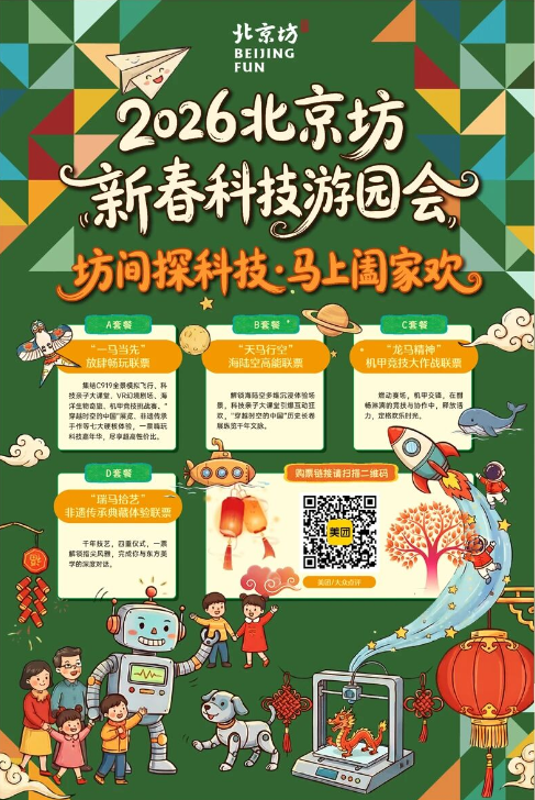 2月17日至3月3日,每天10:00-20:30(最后入场时间19:30),北京坊B1/B2及劝业场将开启“新春科技游园会”,特别推出“一马当先”放肆玩儿、“天马行空”海陆空、和“瑞马拾艺”非遗传承典藏等活动,满足不同亲子家庭的游玩需求。