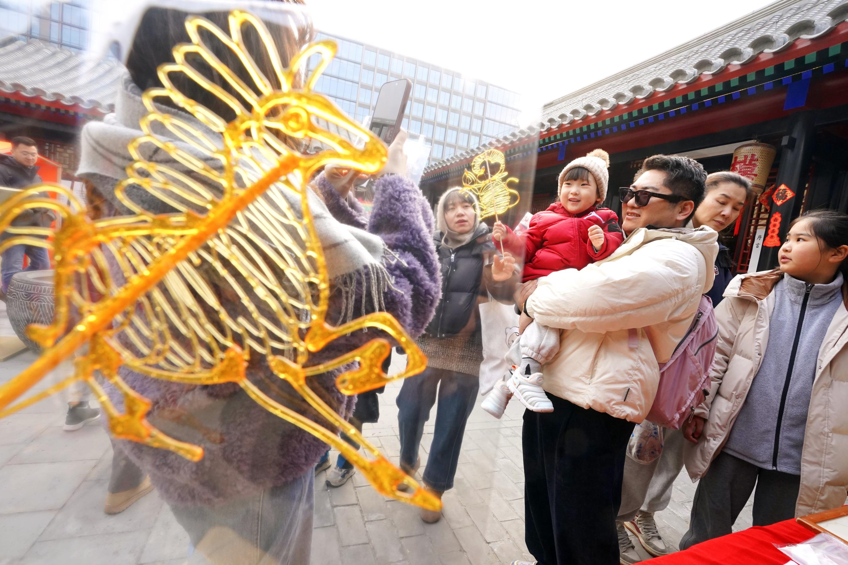 非遗糖画摊位前热闹非凡,手艺人挥毫泼洒,金黄的糖丝勾勒出丙午马年专属瑞马造型,孩童们手持糖画,笑容灿烂。老北京胡同的烟火气与非遗文化的魅力在此交融,八方游客与本地居民穿梭其中,赏灯景、品年味、许心愿,提前感受着2026年春节的热闹氛围。