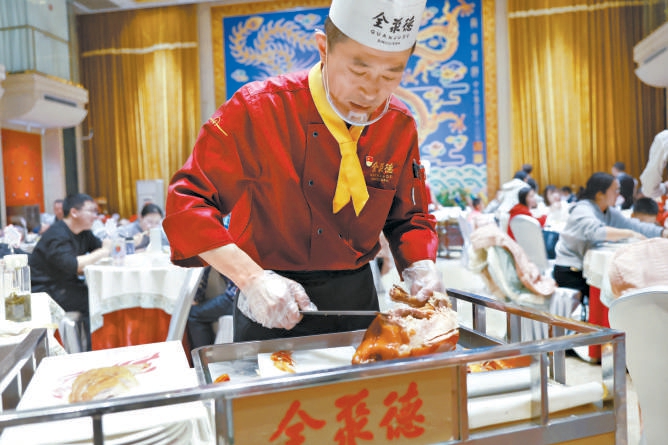 上午10点30分,第一拨预订午餐的客人陆续到店,6位片鸭师忙不过来的时候,崔景立也亲自来到包间为客人片鸭子。“过年好!”看到熟悉的老主顾,崔景立热络地打着招呼,“他们家一连十年都在全聚德吃年夜饭,以前是爷爷奶奶带着来,如今老一辈不在了,晚辈一家子还来,觉得这里有年味儿。”