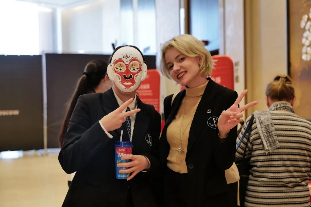 俄罗斯市民戴着京剧脸谱拍照打卡