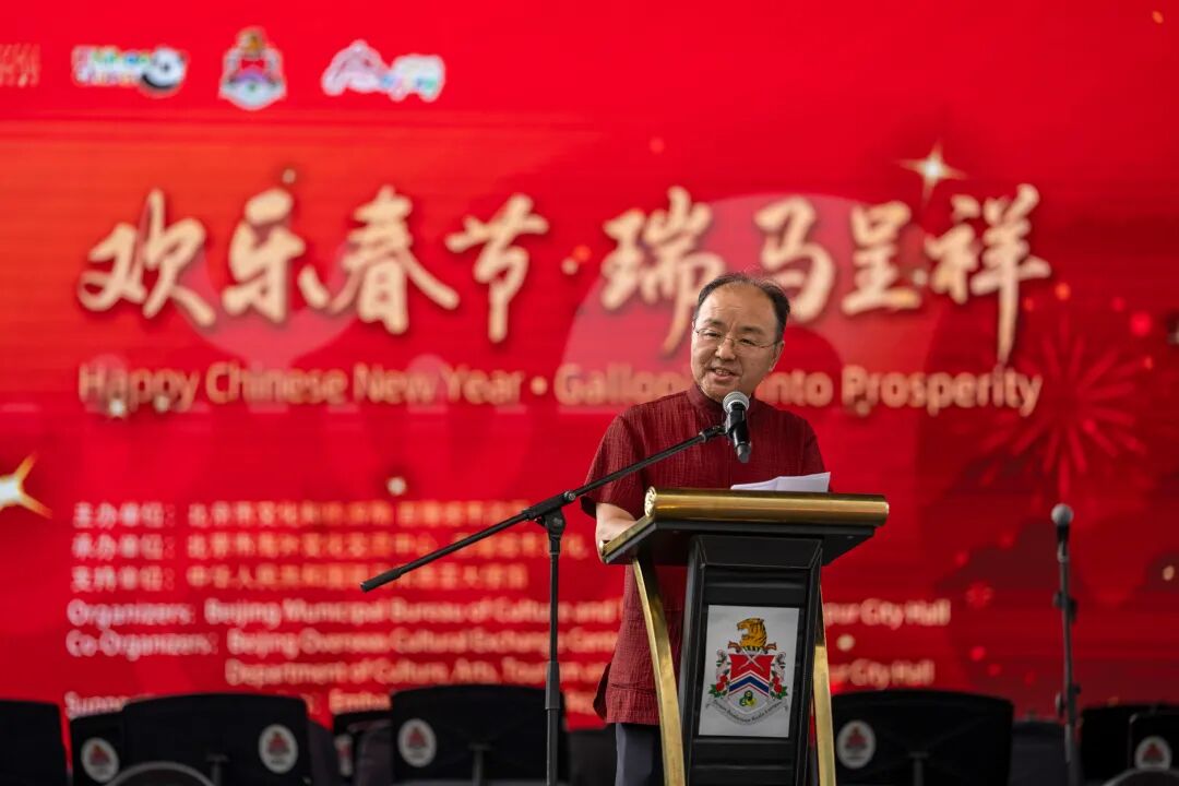 这场跨越山海的新春之约,源于去年5月在北京举办的中马旅游对话活动,活动期间吉隆坡市文化、艺术、旅游和体育局与北京市文化和旅游局签署合作意向书,共同策划在吉隆坡举办“欢乐春节”。时隔九个月,北京团组携“瑞马呈祥”主题文艺演出如约精彩亮相吉隆坡,来自中国与马来西亚的艺术家联袂登台,歌舞交融、好戏连台,与现场观众共庆佳节。马来西亚首相府部长杨巧双、中国驻马来西亚大使欧阳玉靖、吉隆坡市长拿督法伦、北京市文化和旅游局二级巡视员路斌等嘉宾出席活动,与民众一同感受京韵与南洋风情交织的独特“年味”。