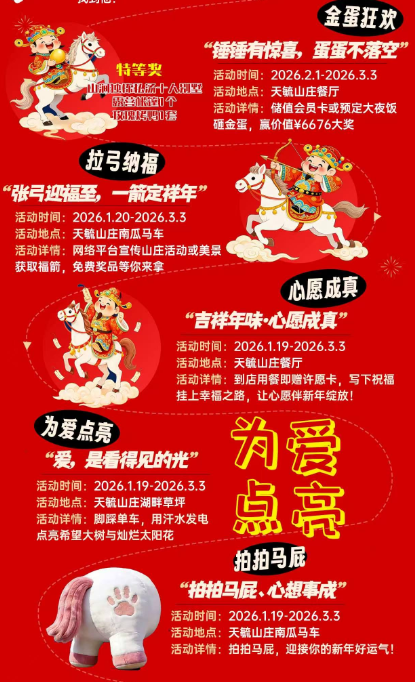 到店用餐还能获赠许愿卡,写下祝福挂在幸福之路,让心愿伴随新年绽放;湖畔草坪上,骑脚踩单车用汗水发电点亮希望大树与太阳花,让 “爱,看得见光”;更能摸摸可爱的 “马屁股” 装置,“拍拍马屁,心想事成”,迎接新年好运气。