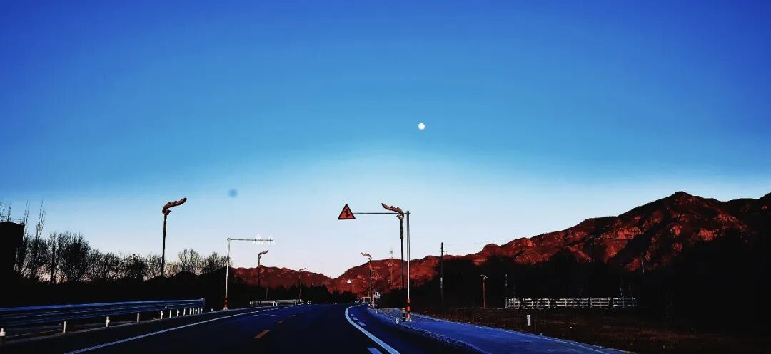 - 月升山巅:傍晚时分,明月悬于澄澈的蓝天,红褐山峦在暮色里愈发温柔,自驾的浪漫在此刻悄然拉满。