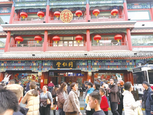 北京同仁堂大栅栏药店相关负责人表示,今年春节期间门店较往年更为热闹,许多市民和游客会先去厂甸庙会感受年味儿,再来大栅栏逛逛老字号,等天色暗了再去北京坊和琉璃厂看花灯,“同仁堂老药铺”成了北京城年味儿的重要组成部分。“除了同仁堂的经典品种中成药,游客对于药食同源、药香同源等大健康产品,以及中药材形象的文创产品都很感兴趣,选购自用或赠给亲朋好友当新春礼物的顾客不在少数。”