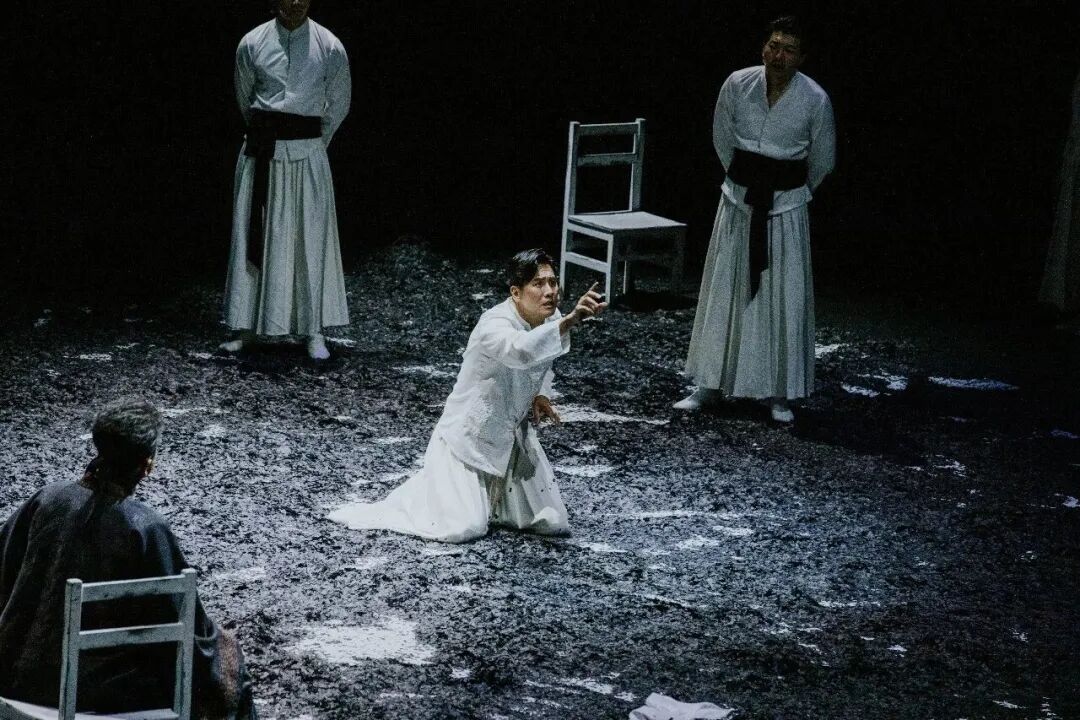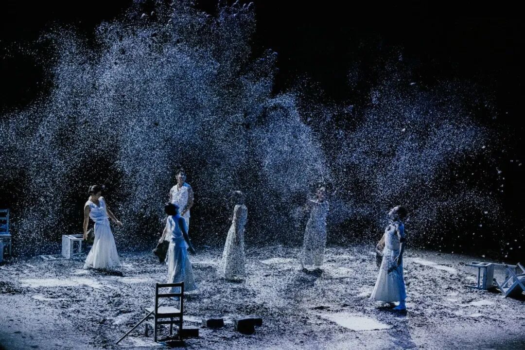 这是一部意蕴复杂的戏,也是一部“令人为难”的戏。之所以复杂,是因其令人为难的单纯。于是,舞台穿透剧作的灵魂,以白衣、黑雪、十把椅子、十位演员,单纯地演绎出简约而变幻莫测的舞台美学。